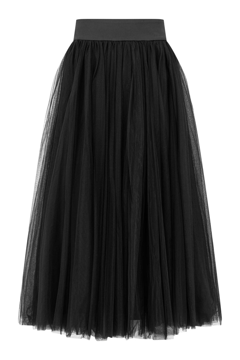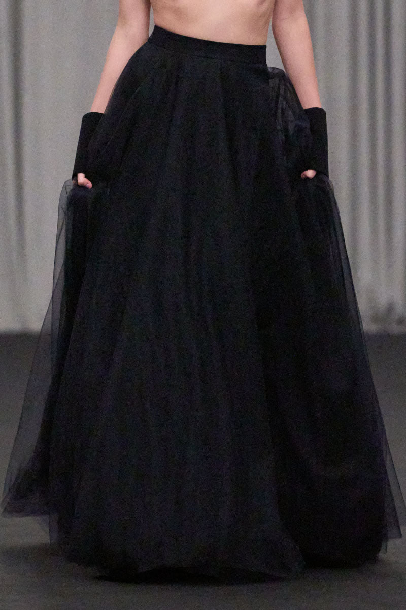 - Elegant A-line long skirt crafted in lightweight tulle for soft volume and fluid movement