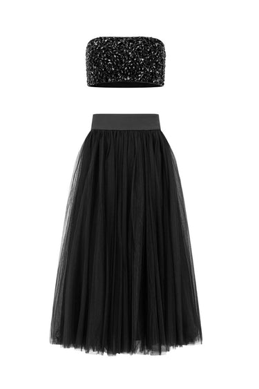- Two-piece set featuring a crepe bralette top and a coordinating A-line tulle long skirt