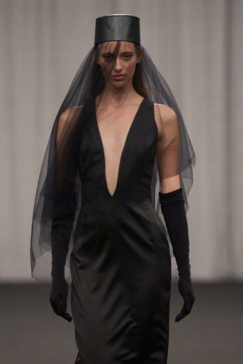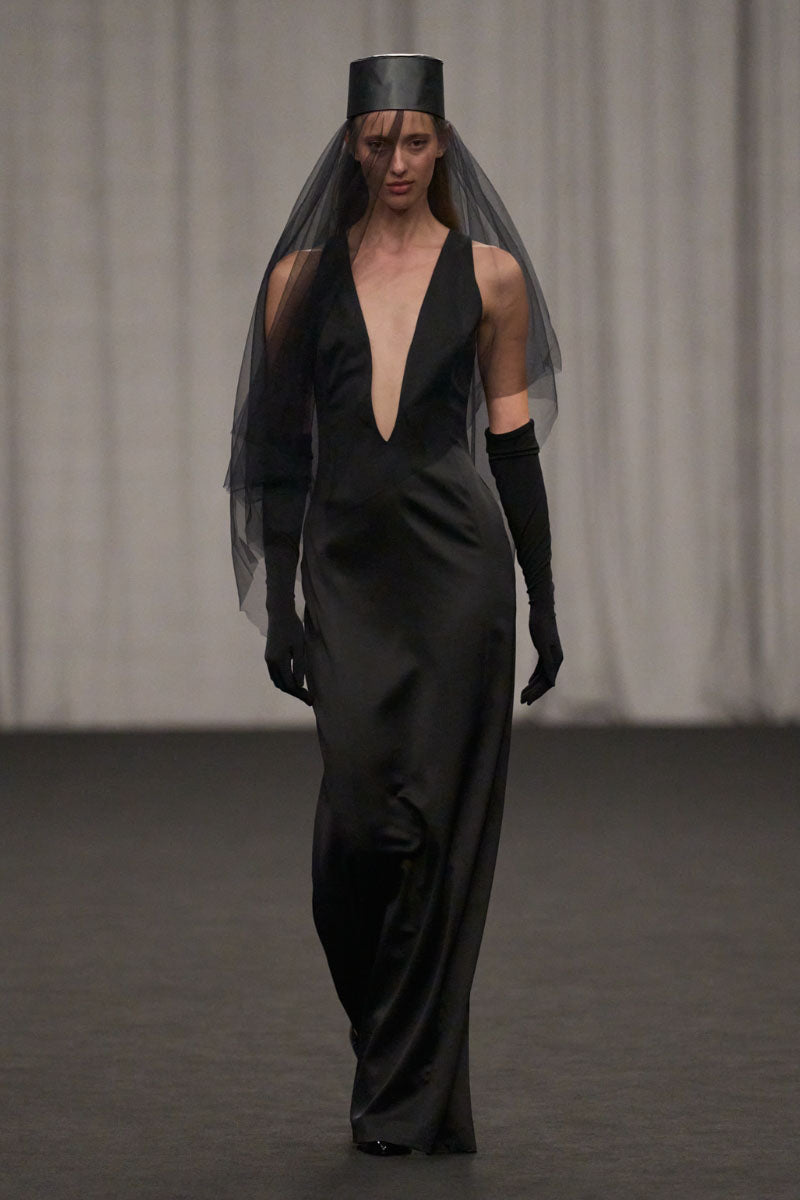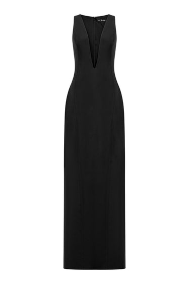 - Long black crepe satin maxi dress with a clean, refined silhouette