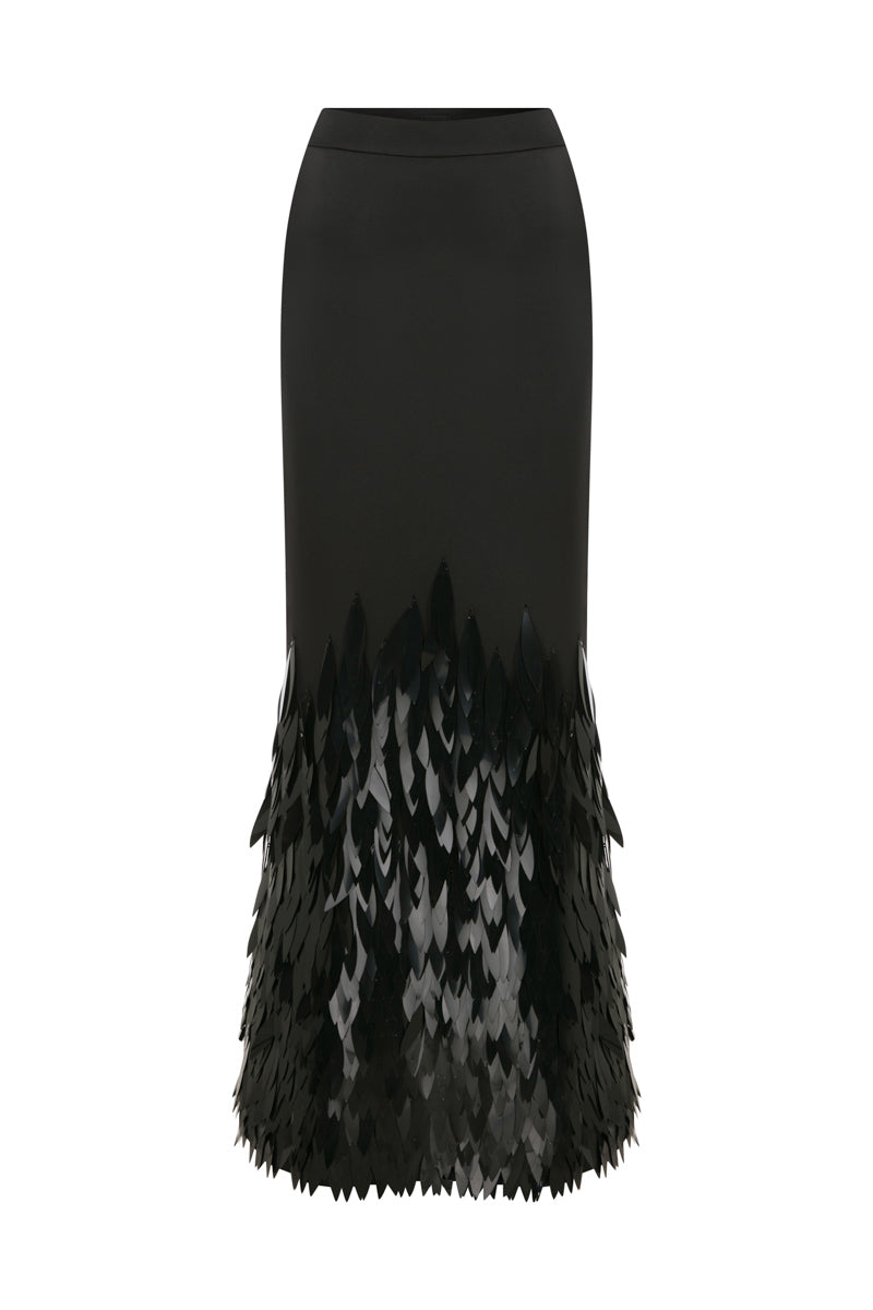 This skirt has a mermaid shape, so strong and feminine with a high waist. It's hand embellished with lustrous leaf-shaped sequins that move with you.