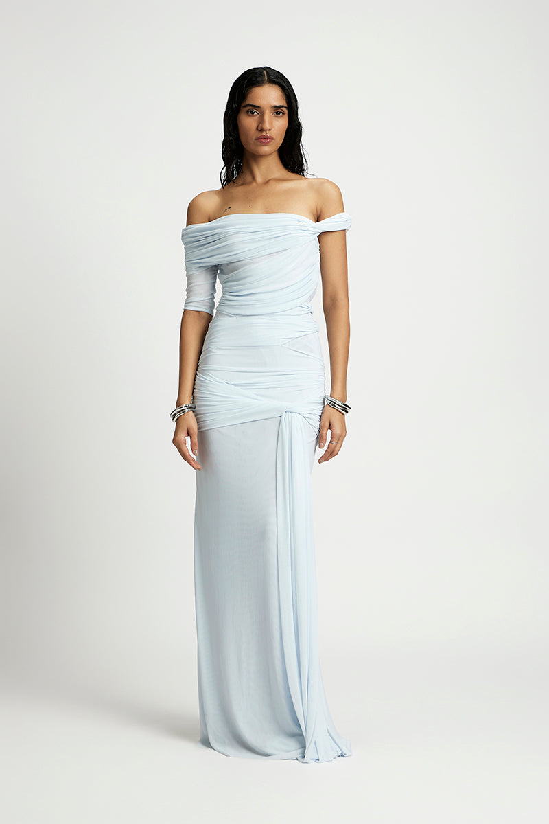 Double-layer net gown with asymmetrical sleeve detailing and draping across the torso and hips