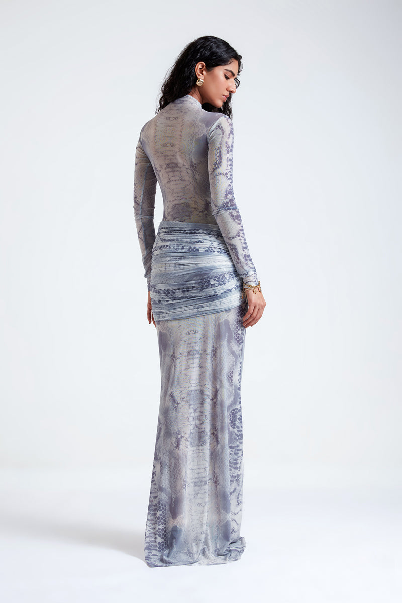 A full-sleeve, body-fitted gown in animal-printed mesh that accentuates the figure, with drapes at the hips.