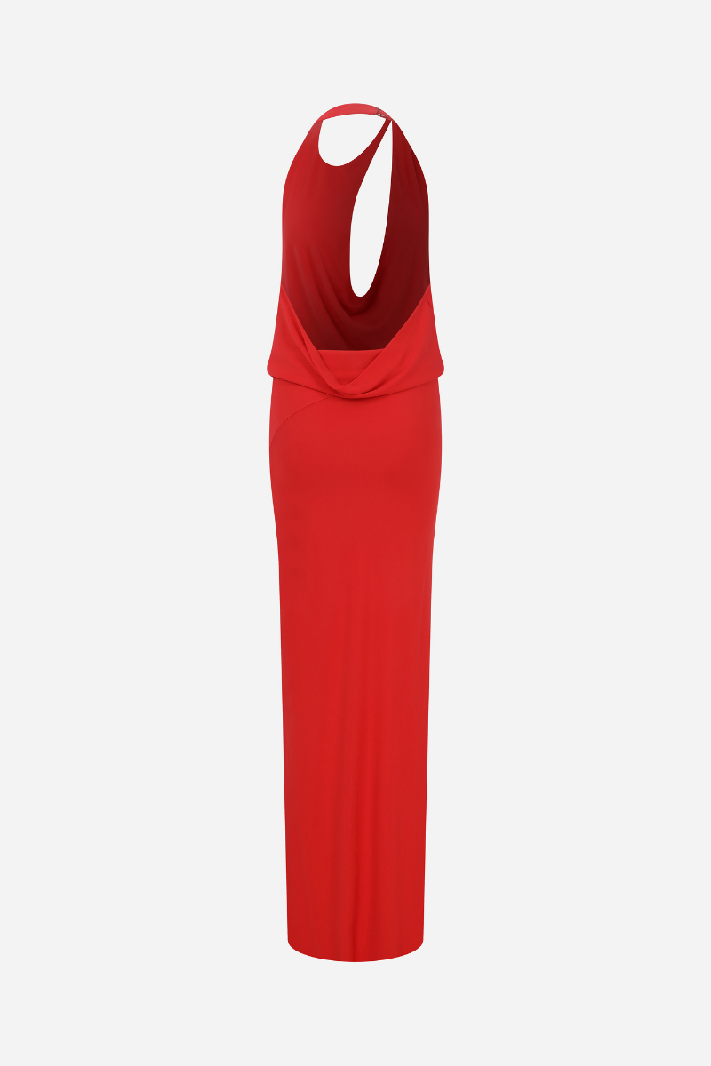 A striking jersey maxi dress featuring a draped cowl neckline and bold cut-out detailing, with a contrast between a relaxed top and fitted skirt for a flattering silhouette.