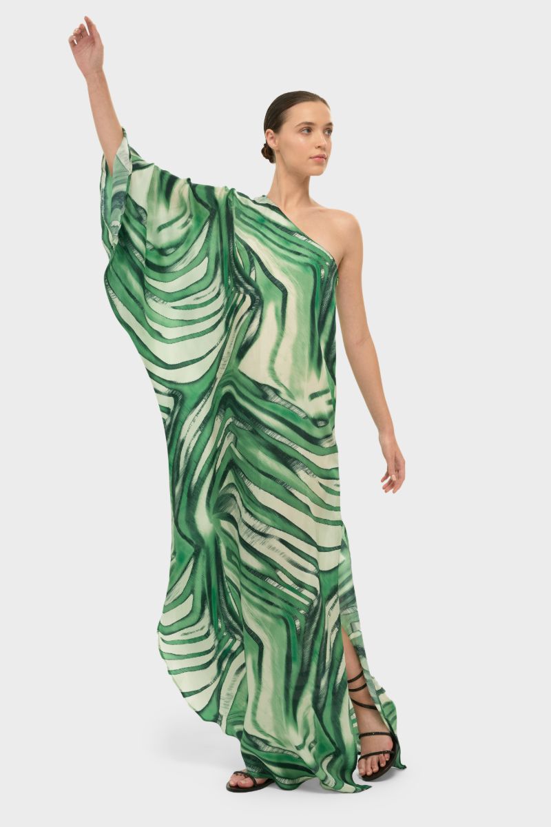 A captivating take on relaxed elegance, the AquaFlora one shoulder dress is crafted with sustainable minimalism for you to embrace your inner goddess. Designed with an asymmetric maxi silhouette, a one-shouldered long raglan sleeve, and a slim leg opening.