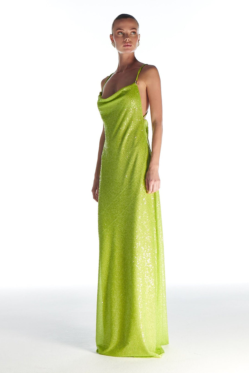 Elevate your look with AURE's GLAM MAXI DRESS, featuring a custom addition of gold trim and a low-cut back for a stunning silhouette.