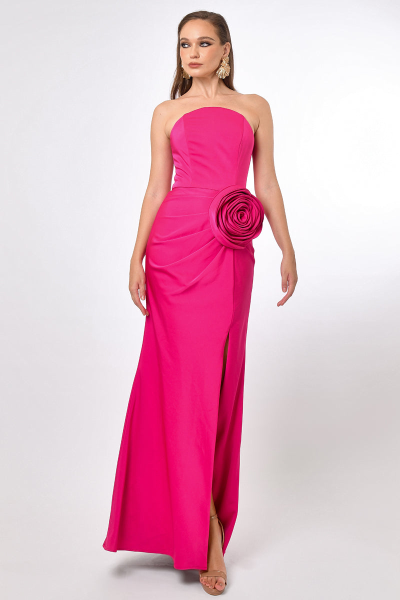 This stunning gown features a curved-up strapless neckline that exudes elegance and sophistication. The structured bodice is enhanced with a detachable large rosette feature, adding a touch of romantic charm. Flowing into a full-length fishtail skirt, the dress showcases a side gather detail and a front-side split, creating a dramatic and graceful silhouette. Fully lined for comfort, this gown is completed with an invisible back zip closure for a seamless and polished finish. Perfect for making a grand entrance, this dress is a captivating choice for any formal occasion.