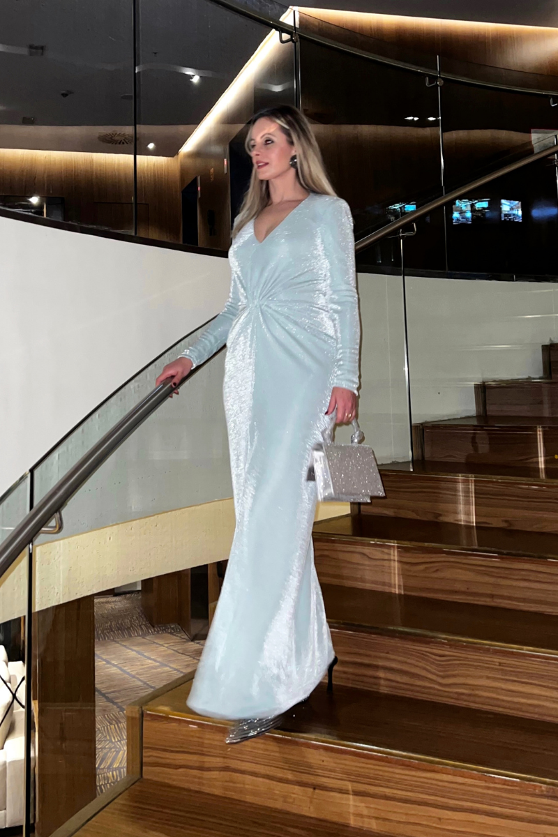 Whether worn to an elegant party or a black-tie event, Monika Dimova’s draped evening dress has a timeless appeal.
