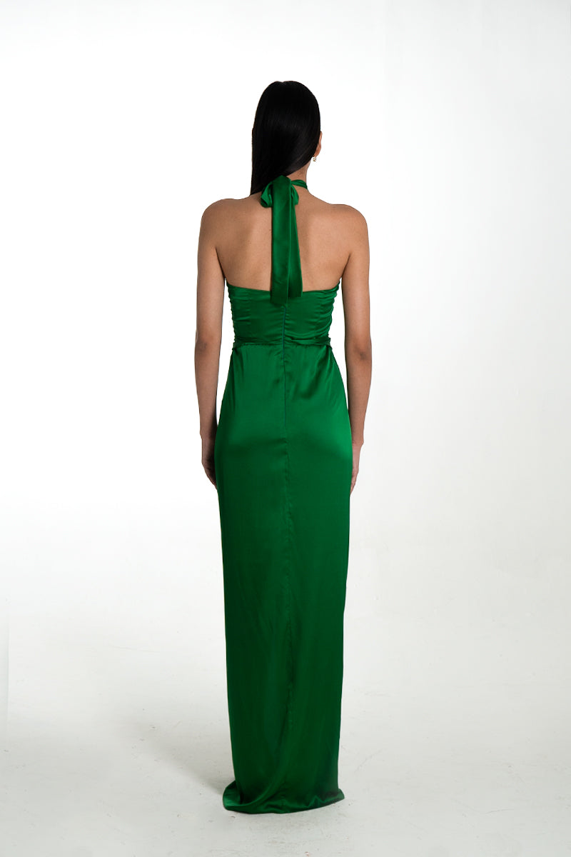 The Cue dress in green, with a nugle that adorns the entire waist and highlights your silhouette. With a wide cut in the middle of the legs, bare shoulders and halter neck.