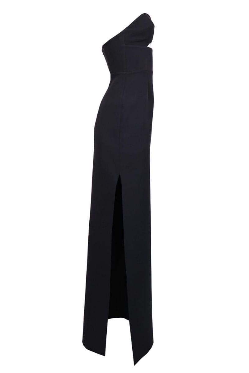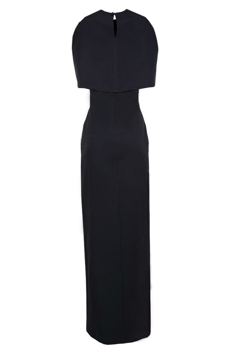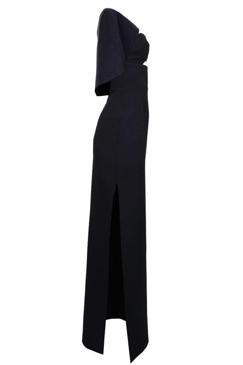 Introducing the ultimate 2-in-1 dress, ideal for those looking to make a stunning impression at two distinct occasions. This dress features a detachable cropped cape, secured elegantly with a single back button. The strapless design is complemented by a waist-accentuating corset, ensuring a flattering silhouette. A chic side slit adds a touch of allure.