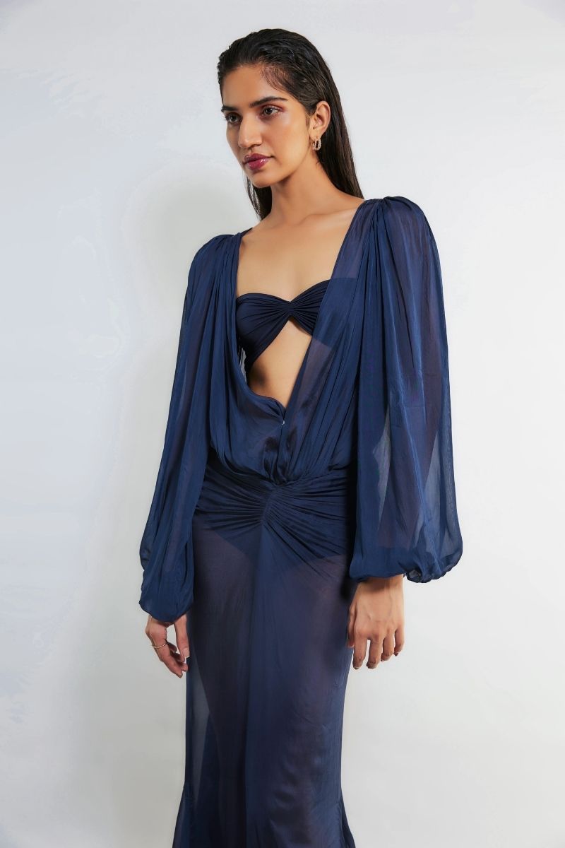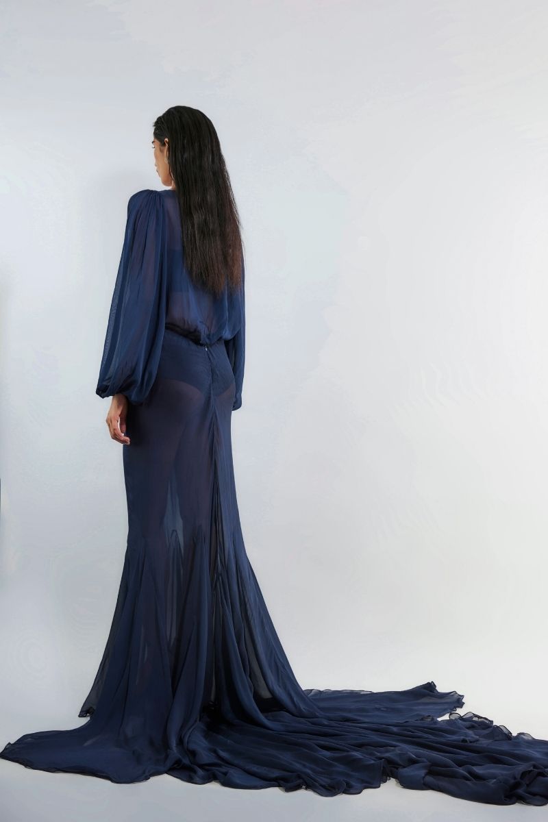 Full-sleeved chiffon top with a flattering V-neck offering a breezy look, paired with a ruched long skirt. Adding a touch of drama and sophistication, the skirt is designed with a flowing train.