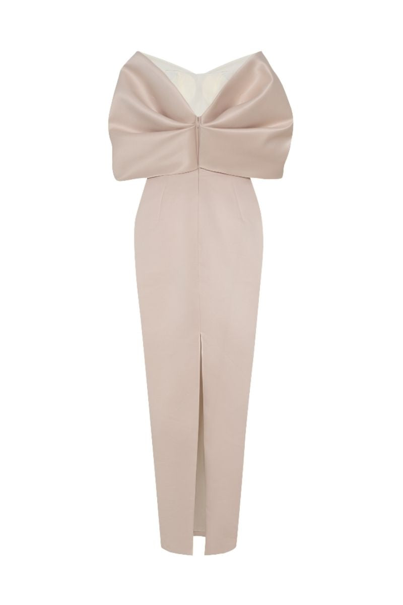 Crafted with exquisite attention to detail, this off-shoulder pencil dress features an invisible zipper down the side, all handmade in Vietnam.