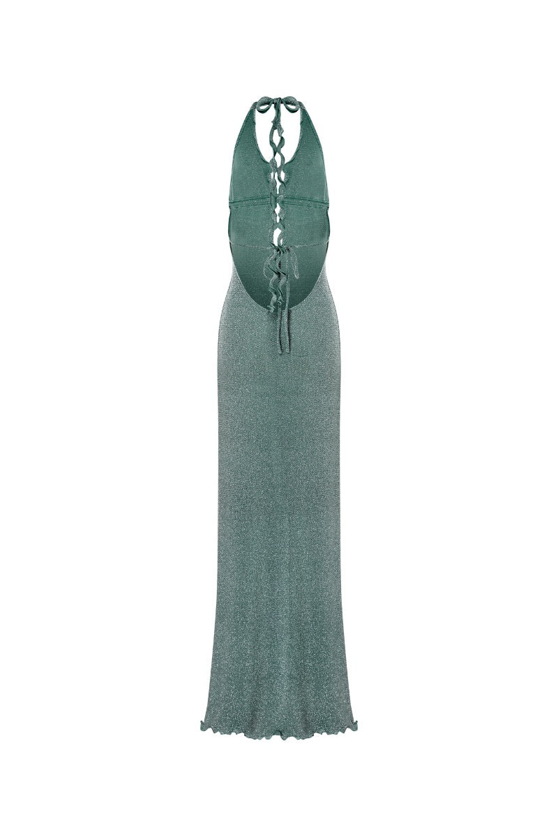The Lyra Maxi Dress showcases a chic halter neck with a tie closure, complemented by a daring low neckline and an alluring open back. Designed with high-quality sparkly lurex fabric.