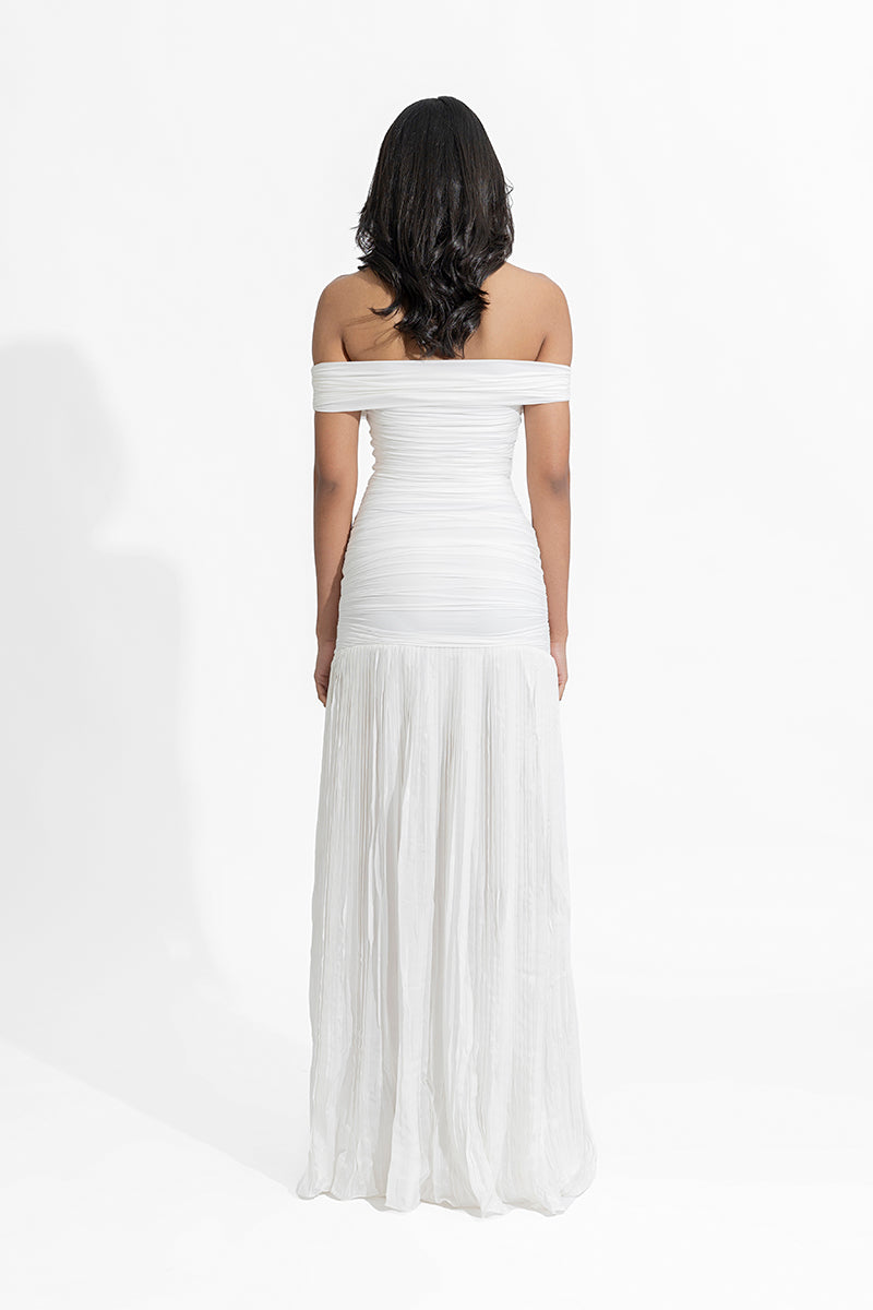 Off-shoulder ruched gown with a drop waist and flowy crepe skirt design detail.