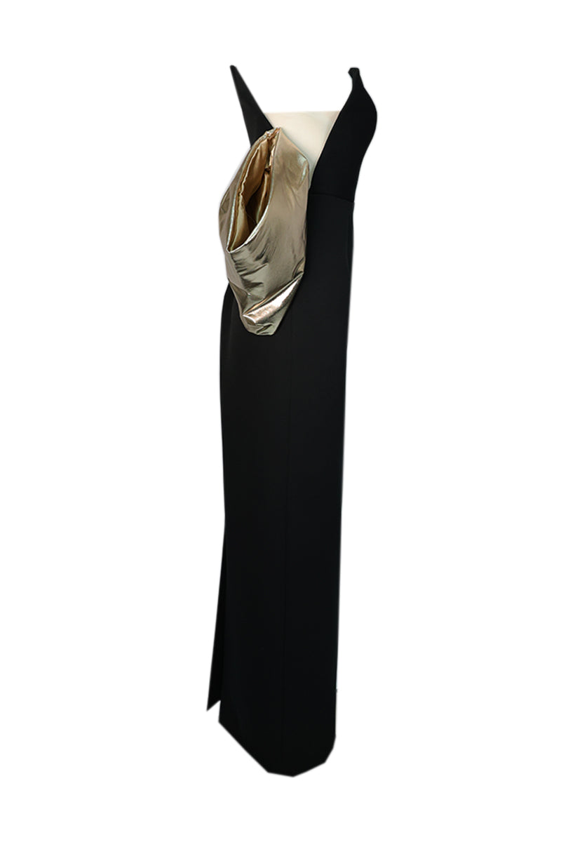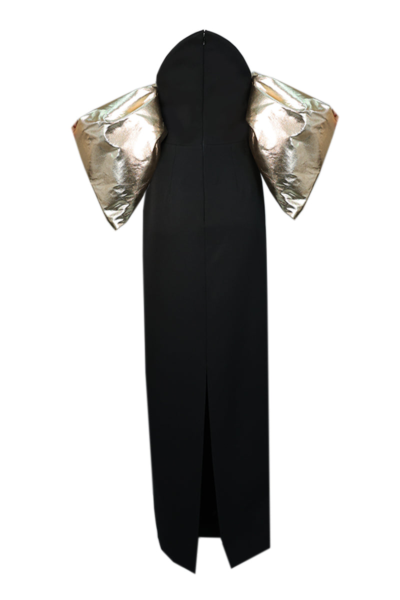 The Circular Bodice Gown is a standout piece, combining elegance with unique design elements. This strapless gown features a meticulously hand-stitched circular corset, providing structure and sophistication. The sheer sides of the corset add a tasteful touch of allure, making the dress both sexy and elegant