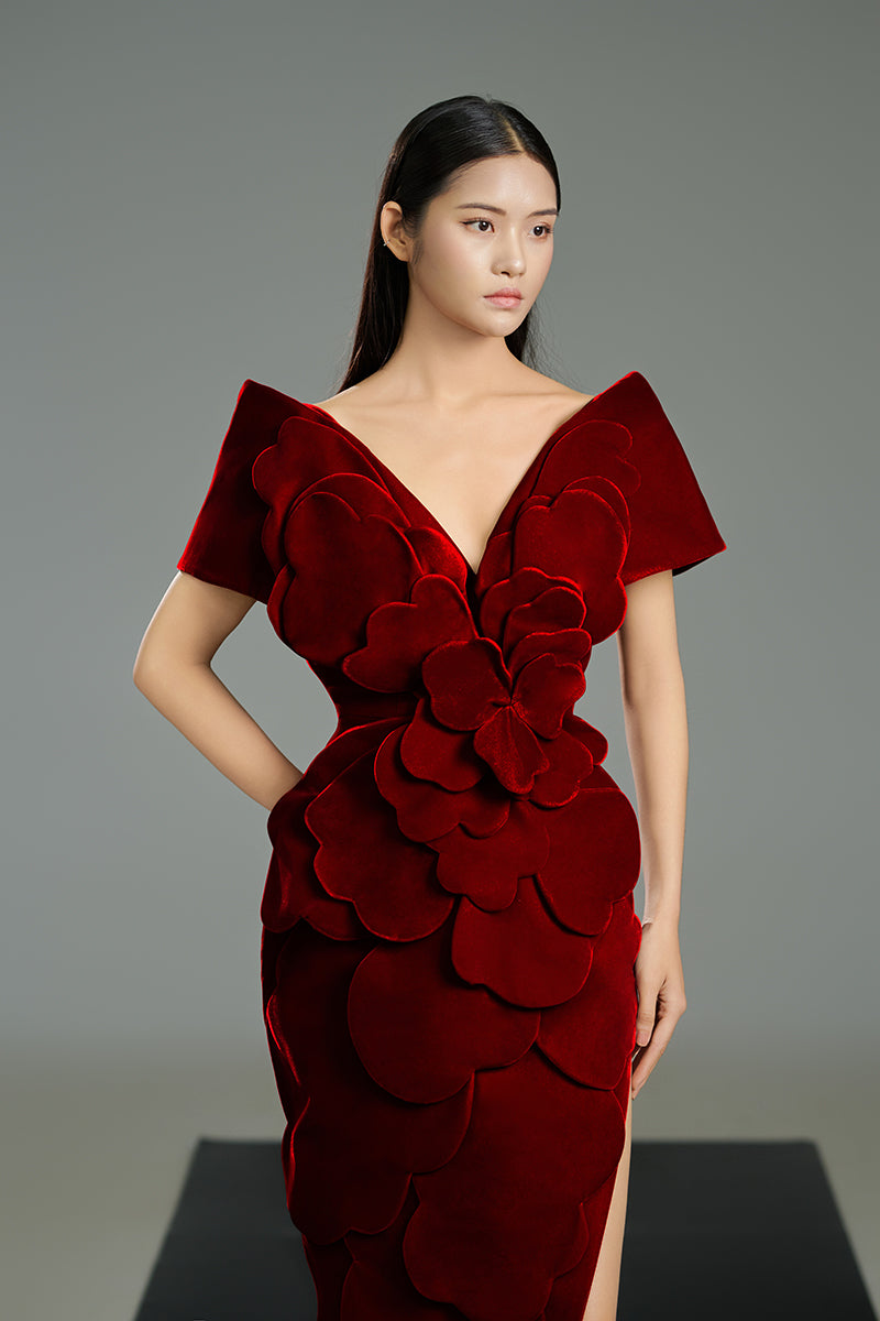 The elegant red dress features a V-neckline, structured shoulders, and layered petal-like details that create a 3D effect. Its highlight is a high slit, accentuating a sophisticated and alluring look.The fabric appears rich, with a velvety texture, enhancing its luxurious appeal.