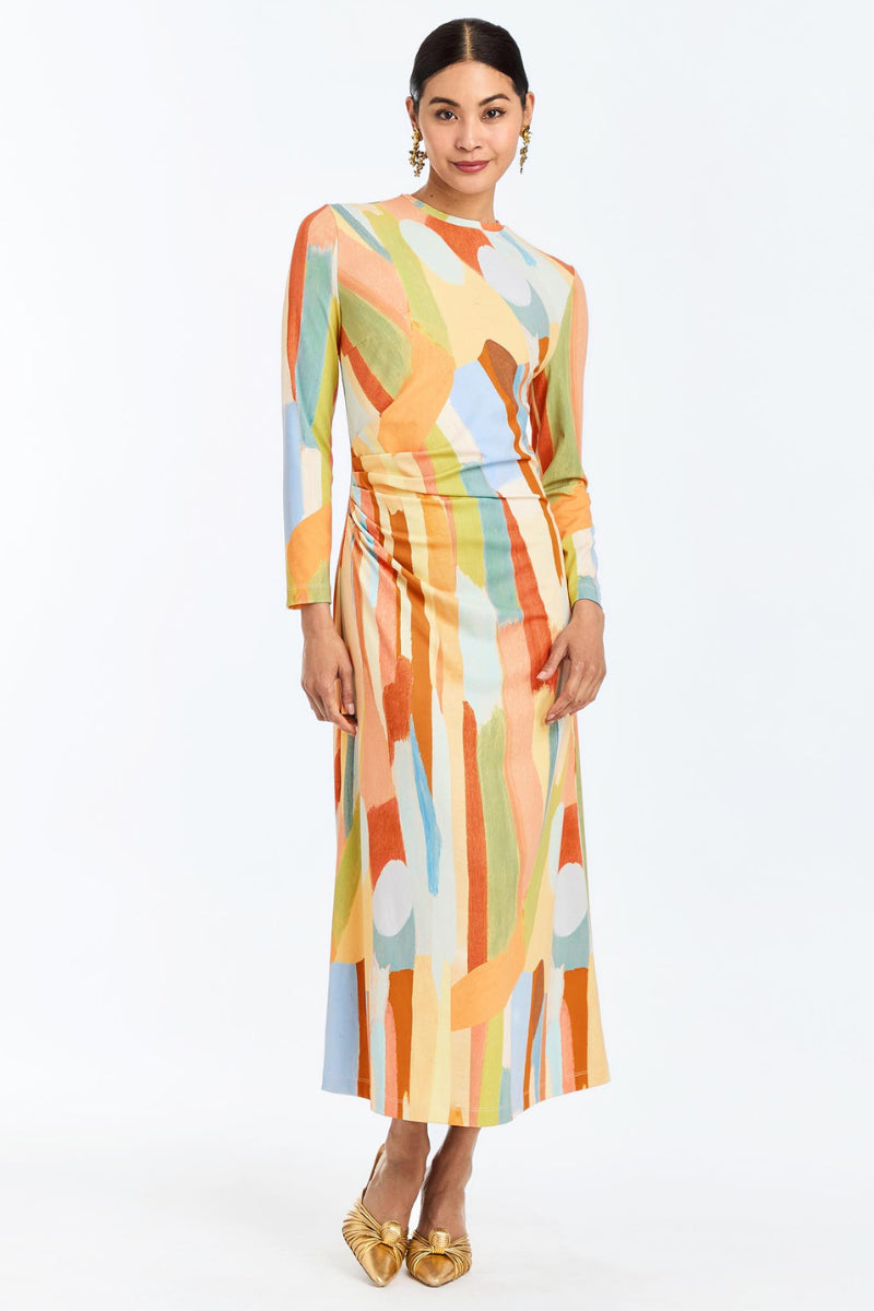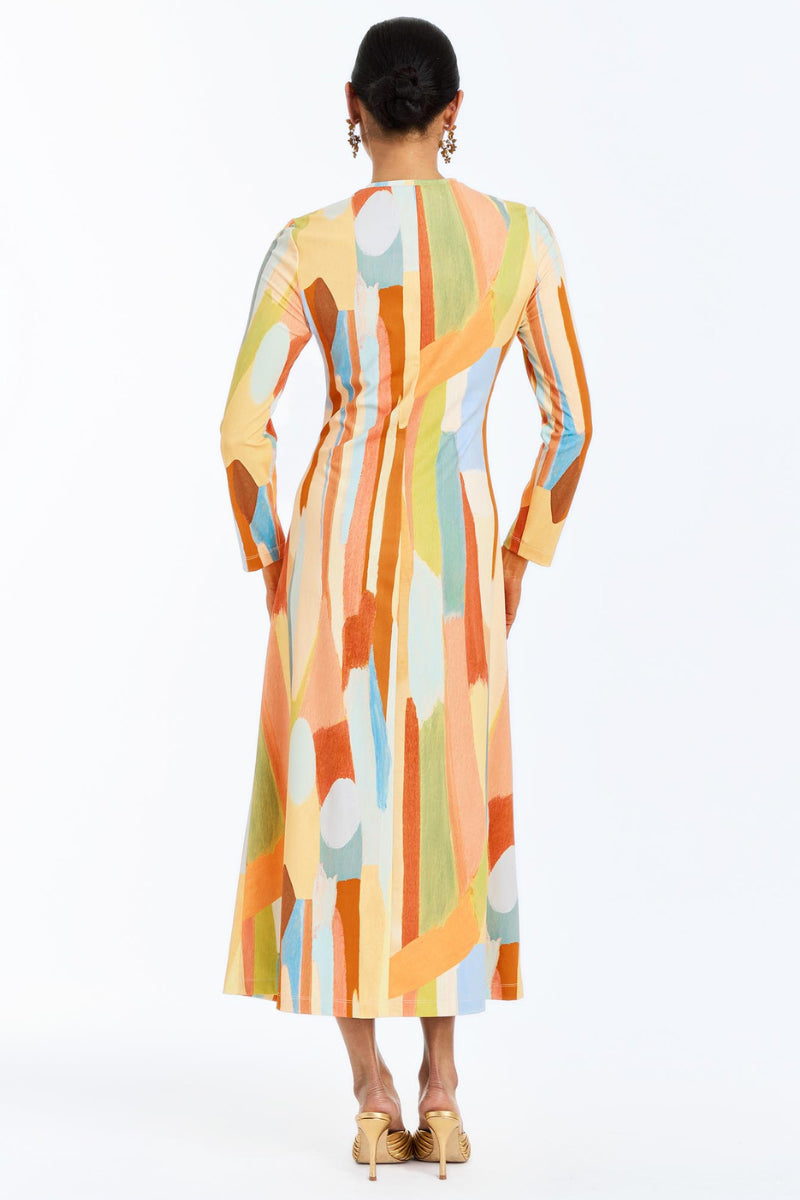- A-line silhouette daytime midi dress featuring a body-skimming crew neckline