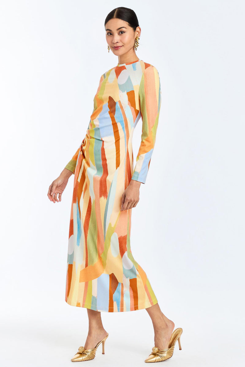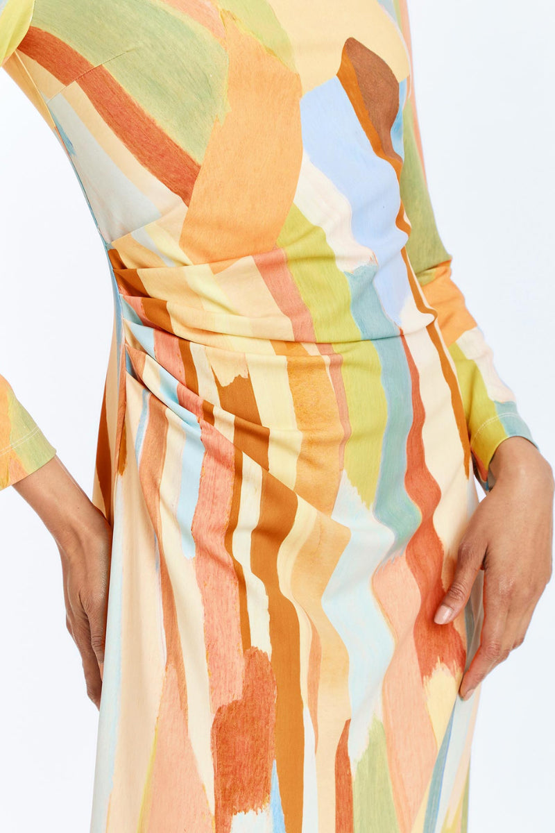 - Side seam ruching detail at wearer's right waist