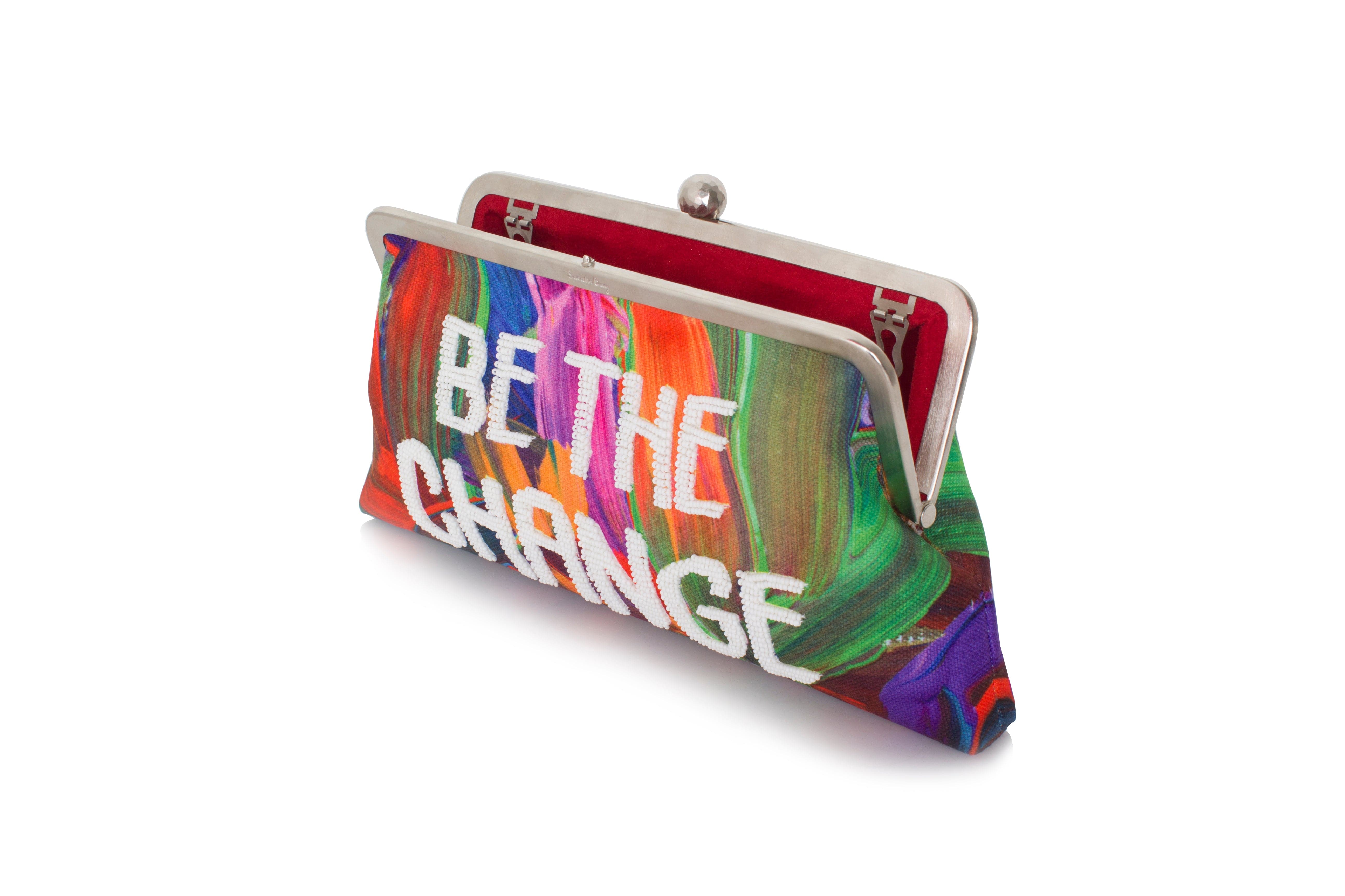 Add a positive bright note to your look with our exclusive "Be The Change" bag, uplifting daytime casuals, or your favorite pair of chic jeans. This bag is intricately beaded using glass beads and cotton thread. This roomy and colorful clutch is perfect for women who like their bags big and their statement style even bigger.