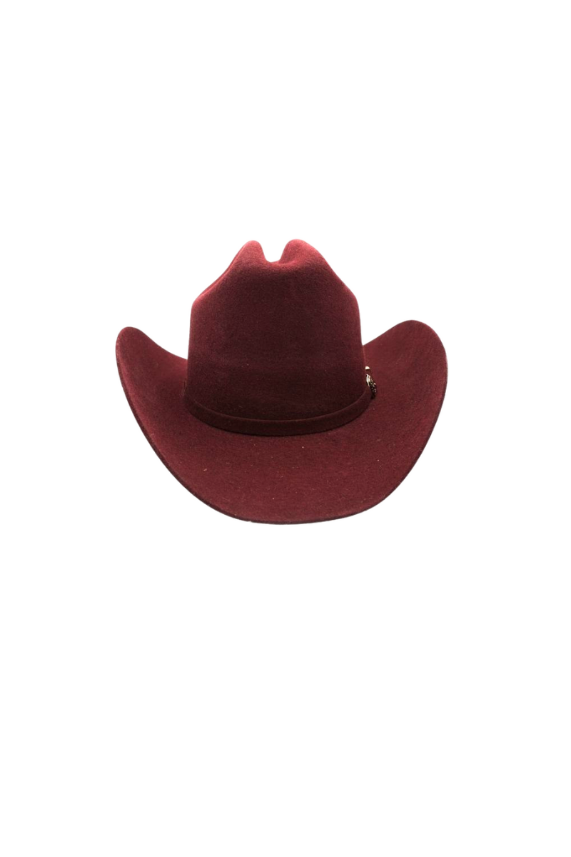 - Burgundy texan felt hat with matching thin trim