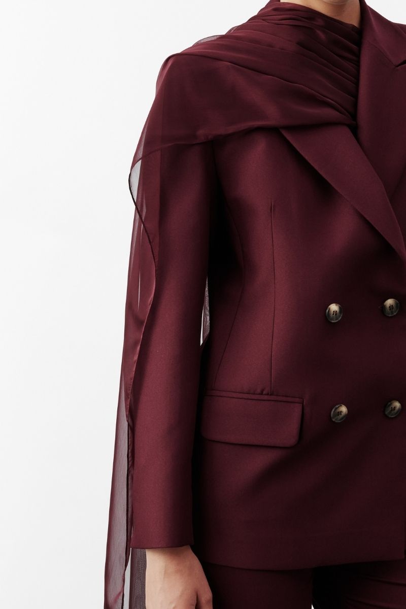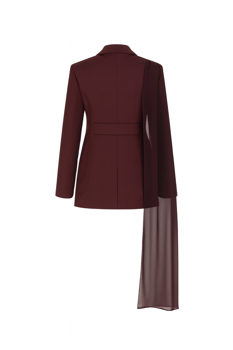 - Detachable chiffon fabric detail emerging from the inner lapel