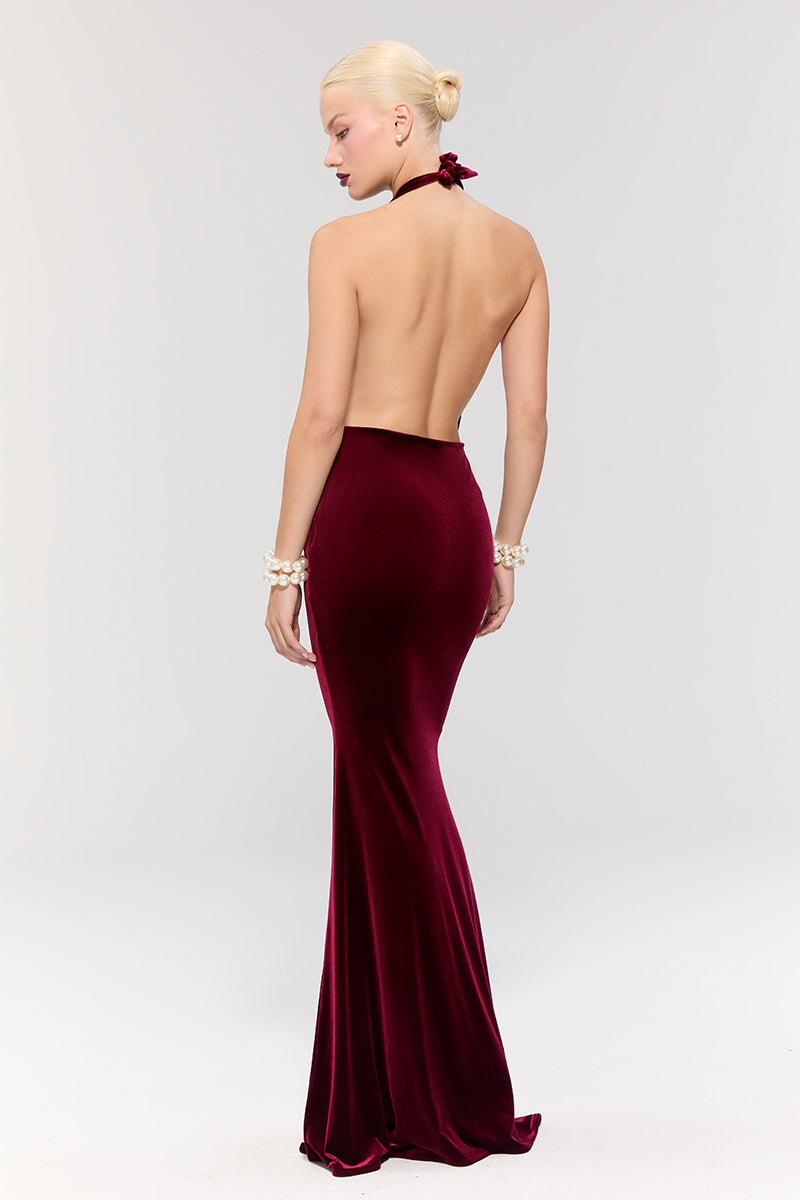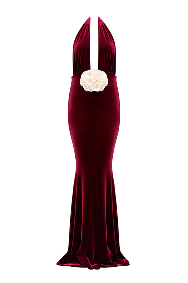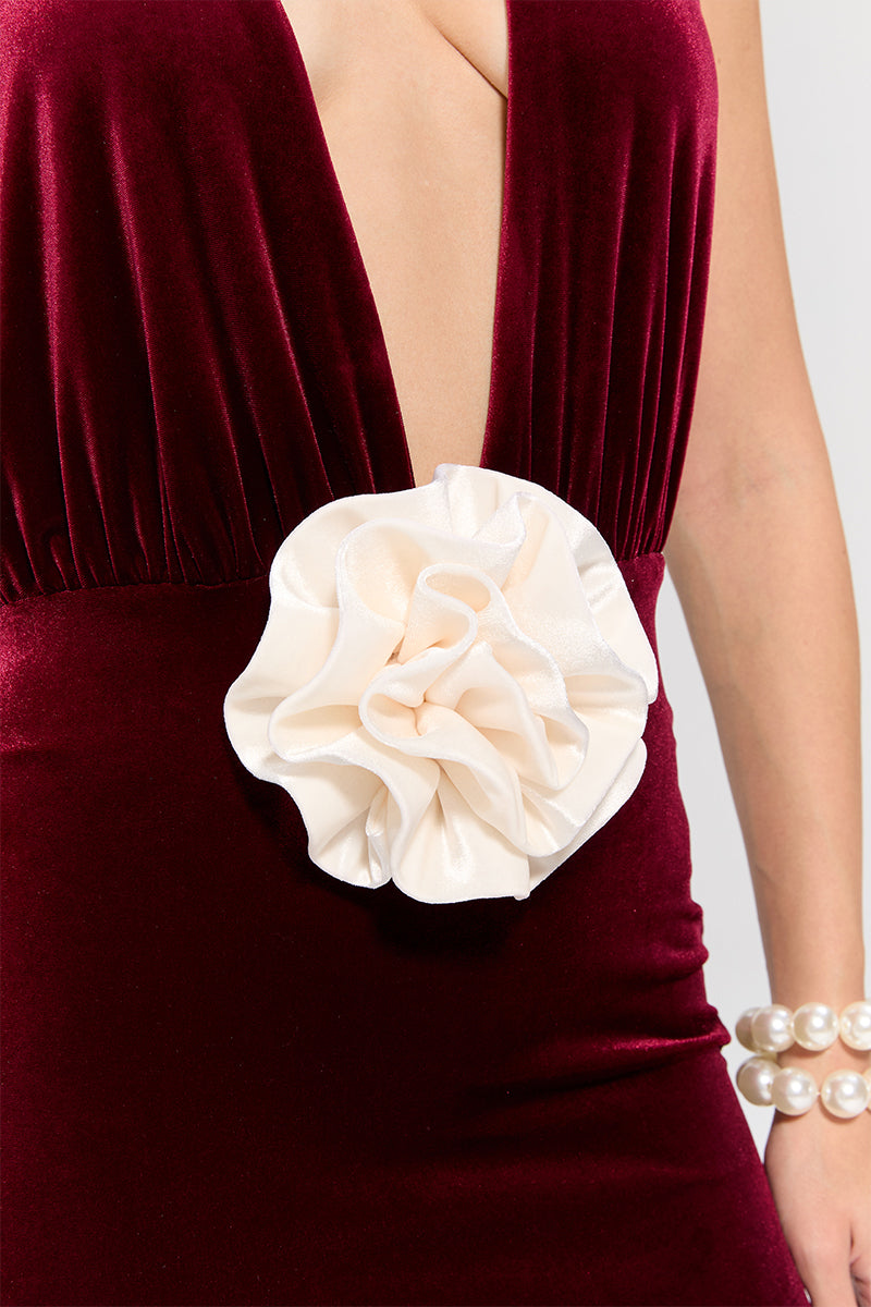 - The dress features a deep V-neck and back cutout, with a large waist flower adding a feminine touch