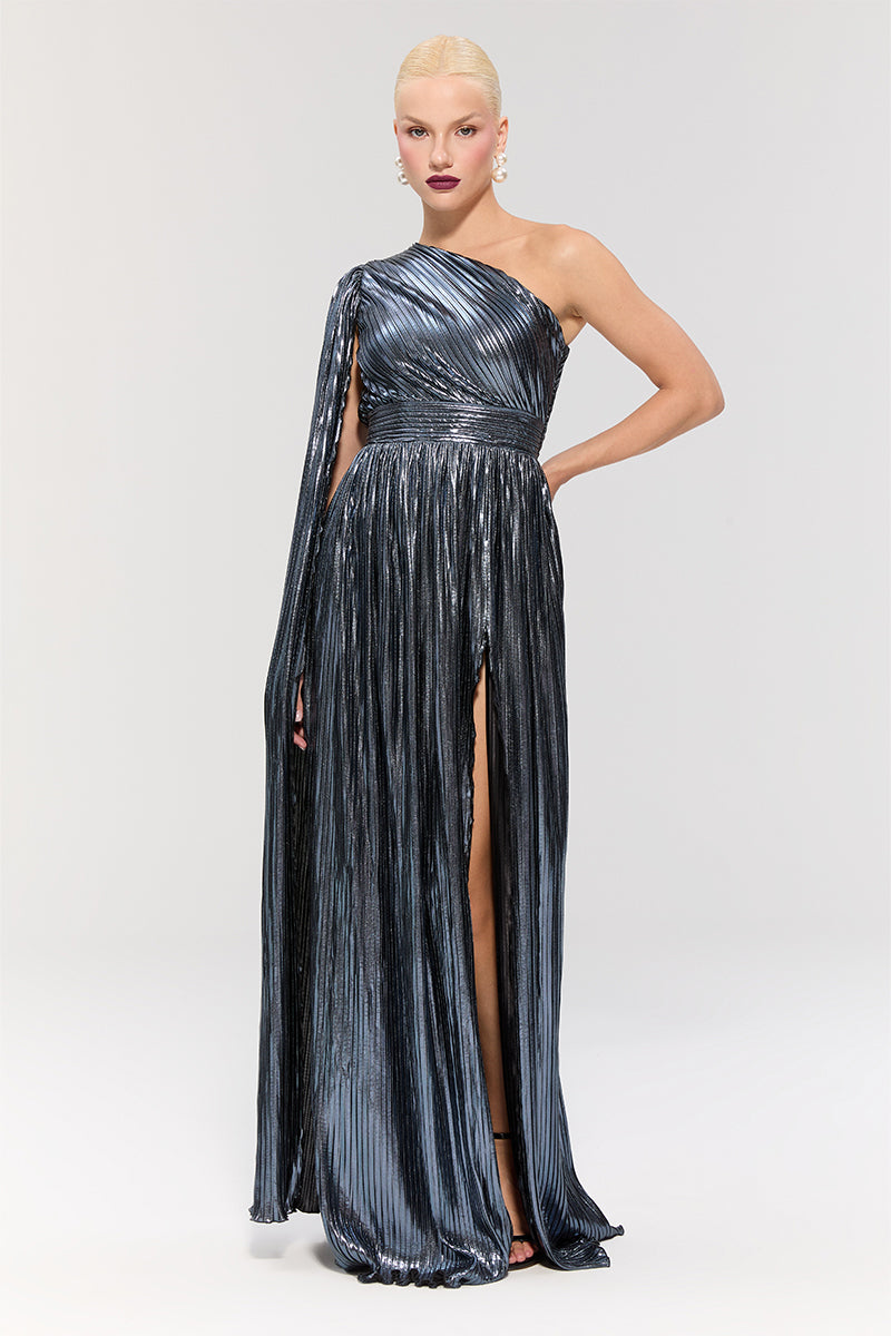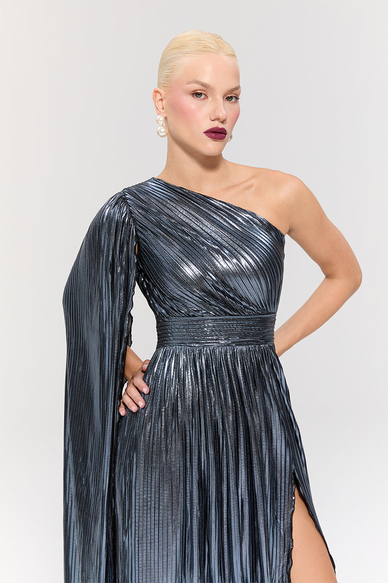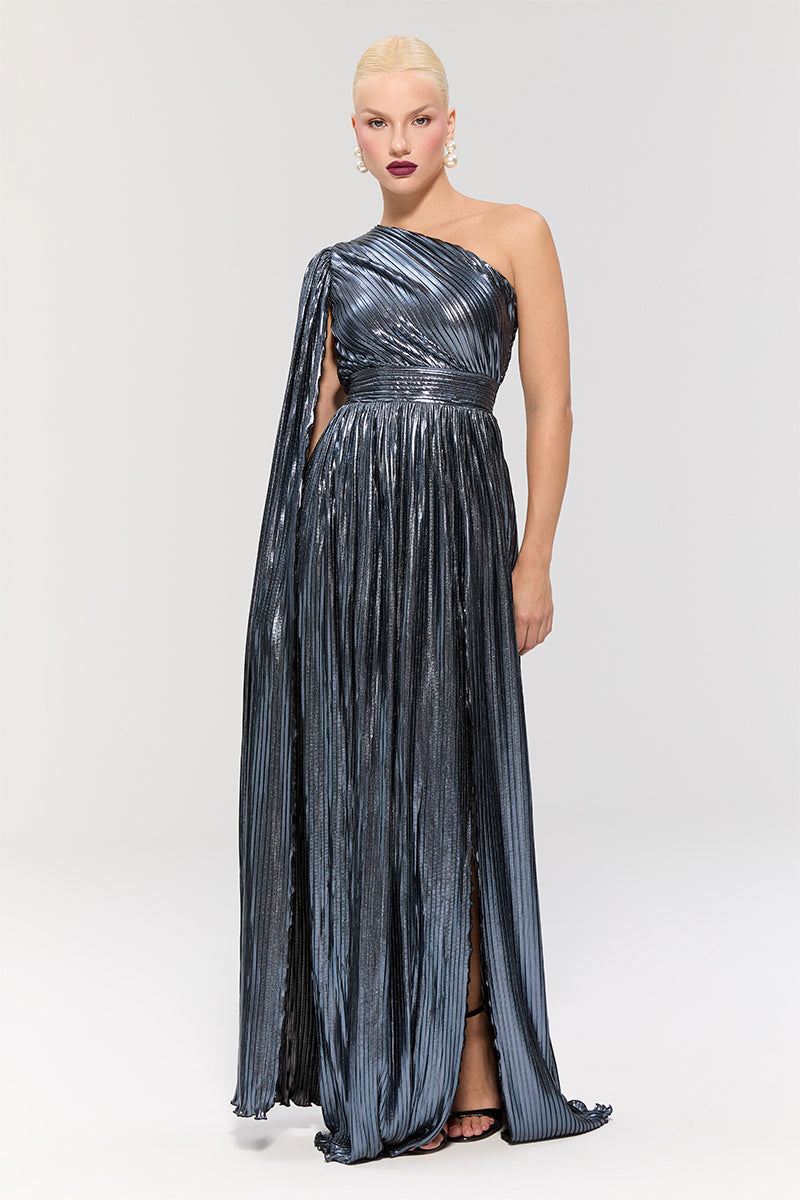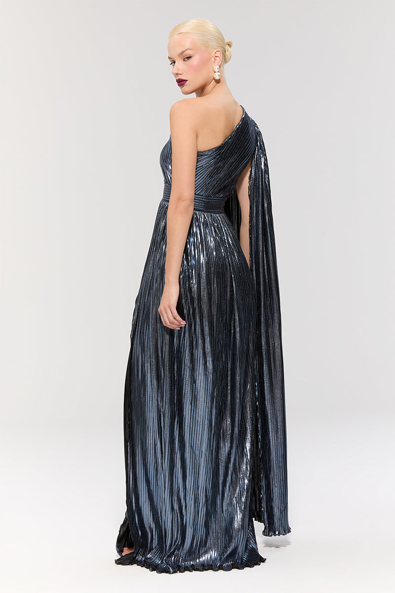 - The one-shoulder navy dress features a long cape, asymmetric neckline, and waist belt for a sophisticated, striking look