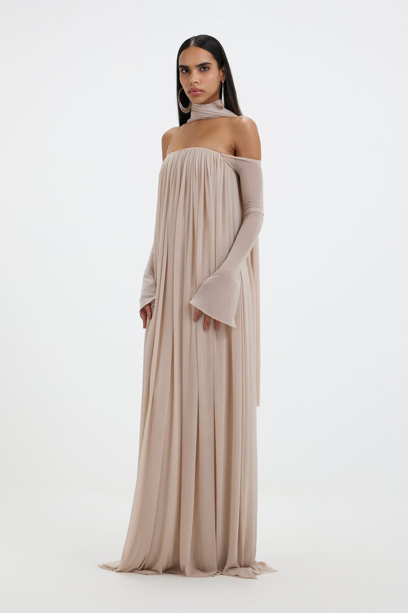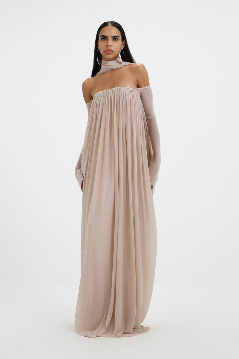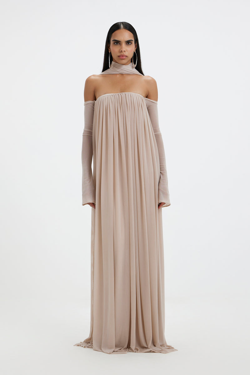 - Tube gown features soft pleating at the bust that adds movement and femininity. The long, sheer sleeves fall gently from the arms,