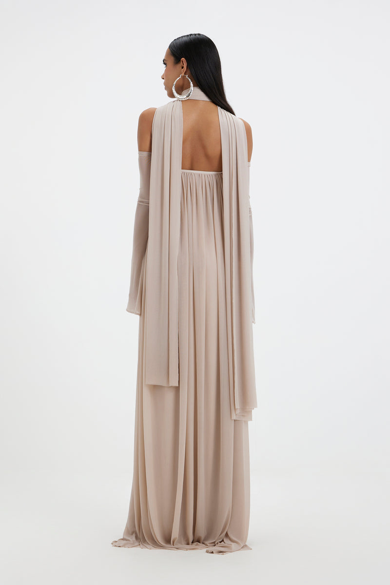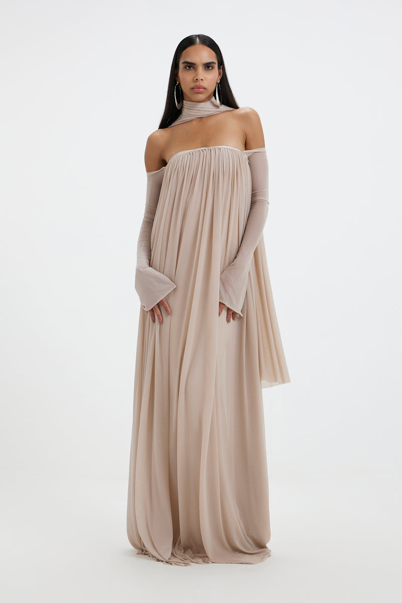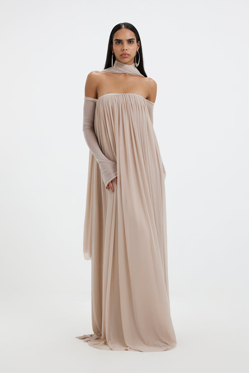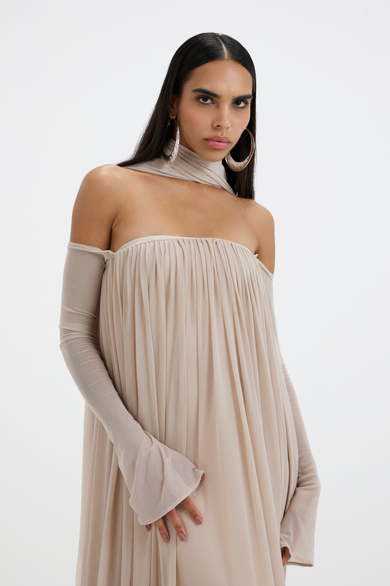 - Tube gown features soft pleating at the bust that adds movement and femininity. The long, sheer sleeves fall gently from the arms,