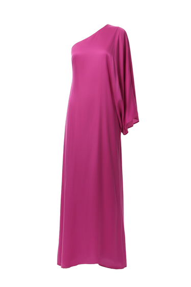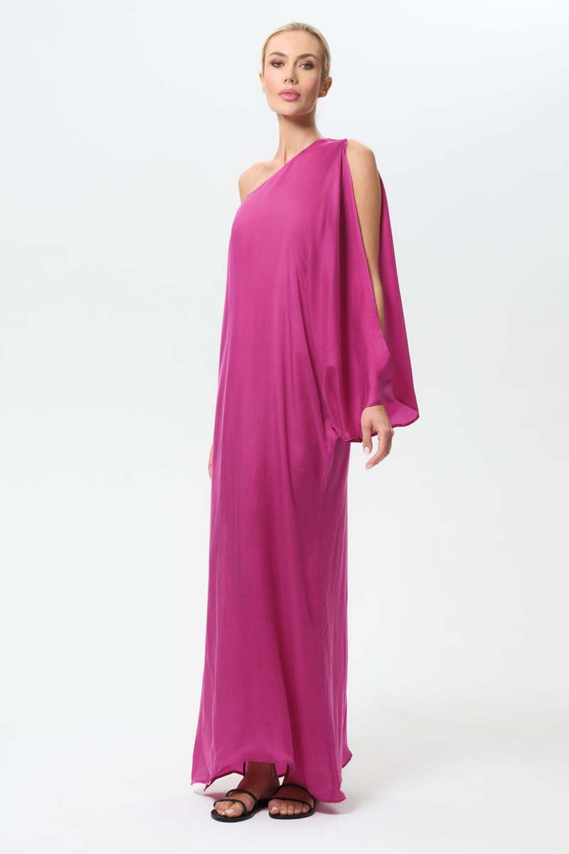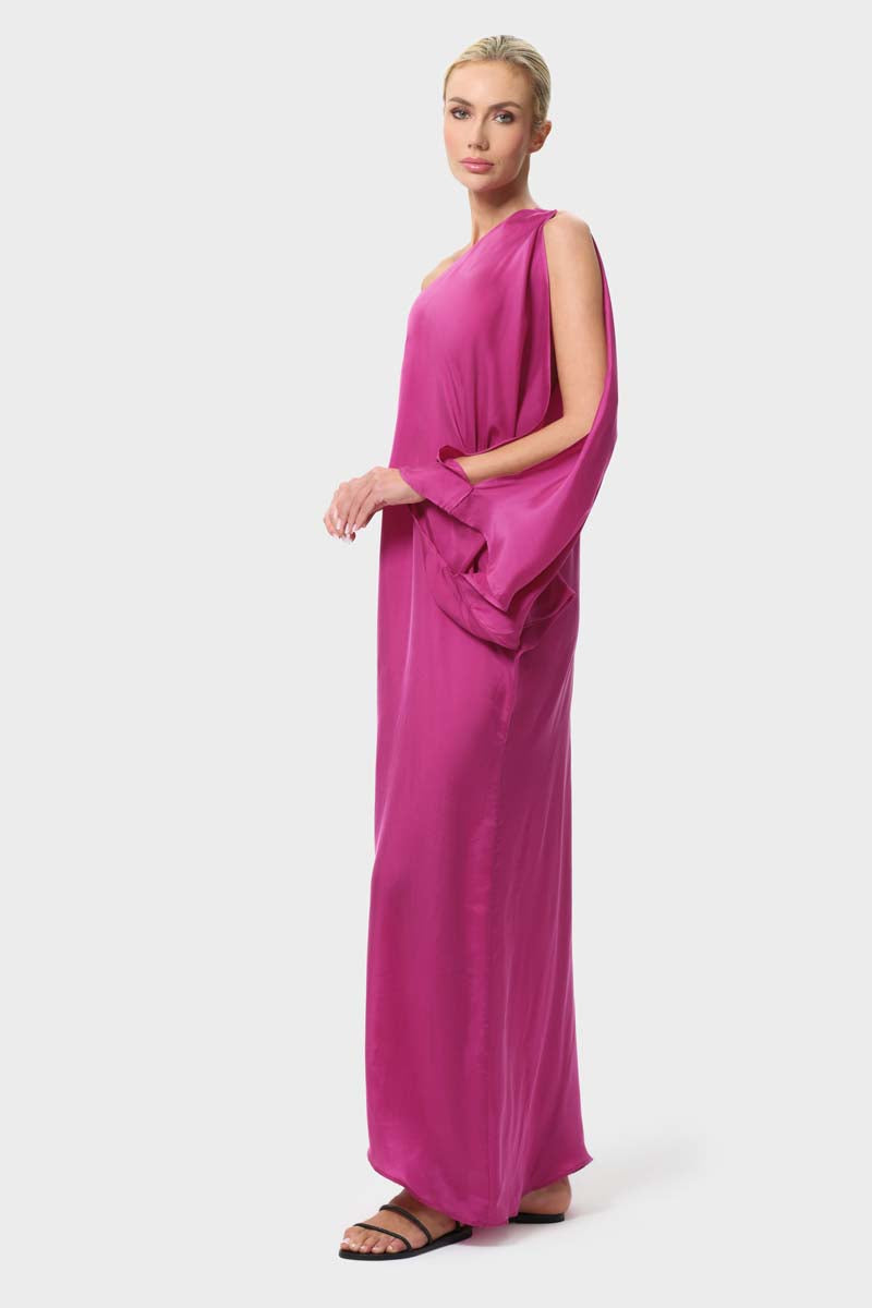 A captivating take on relaxed elegance, the Calypso One Shoulder Dress is crafted with mindful minimalism embracing your inner goddess. This asymmetric maxi has a long one-shouldered draped slit sleeve as well as an elegant side seam opening that reveals part of the leg.