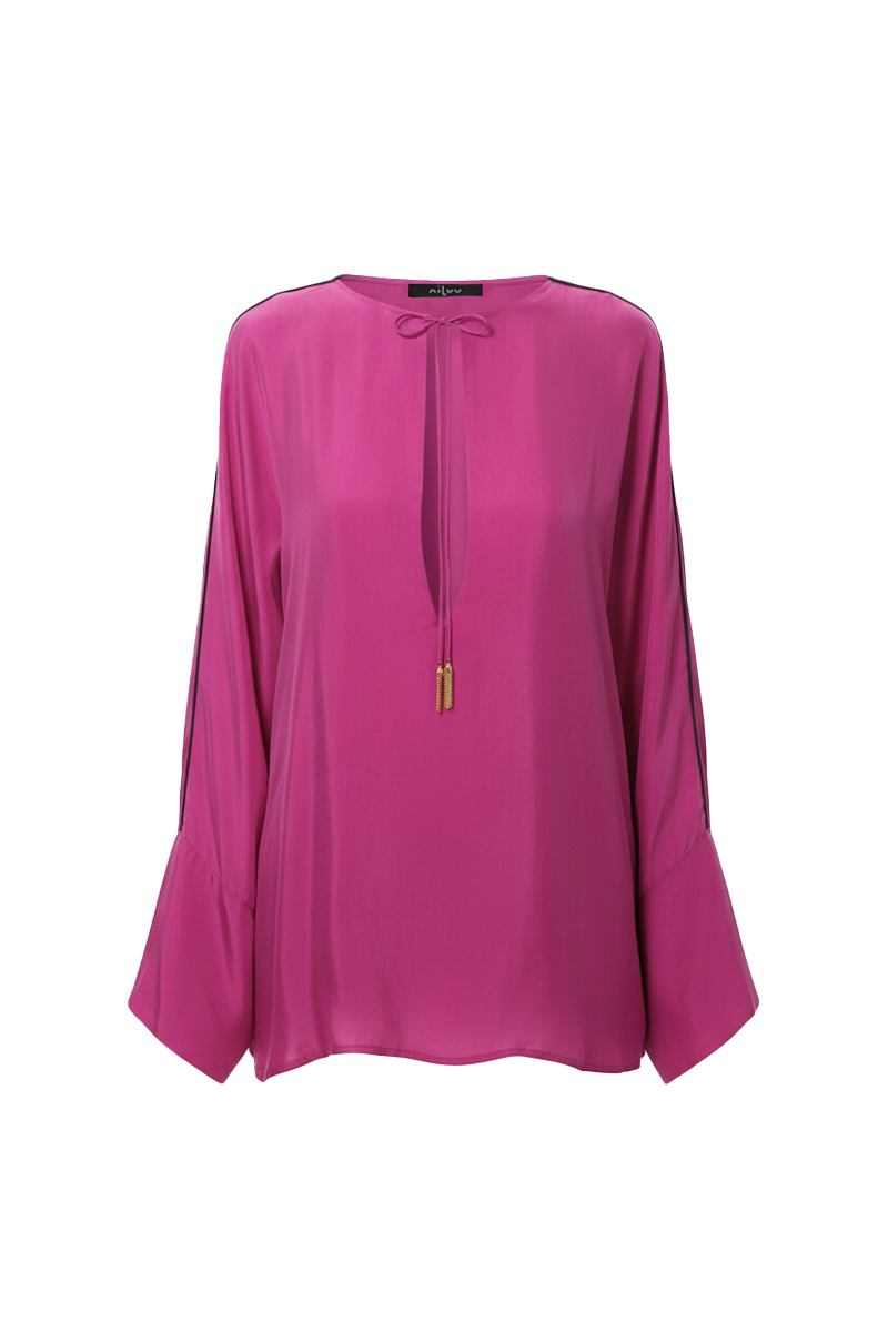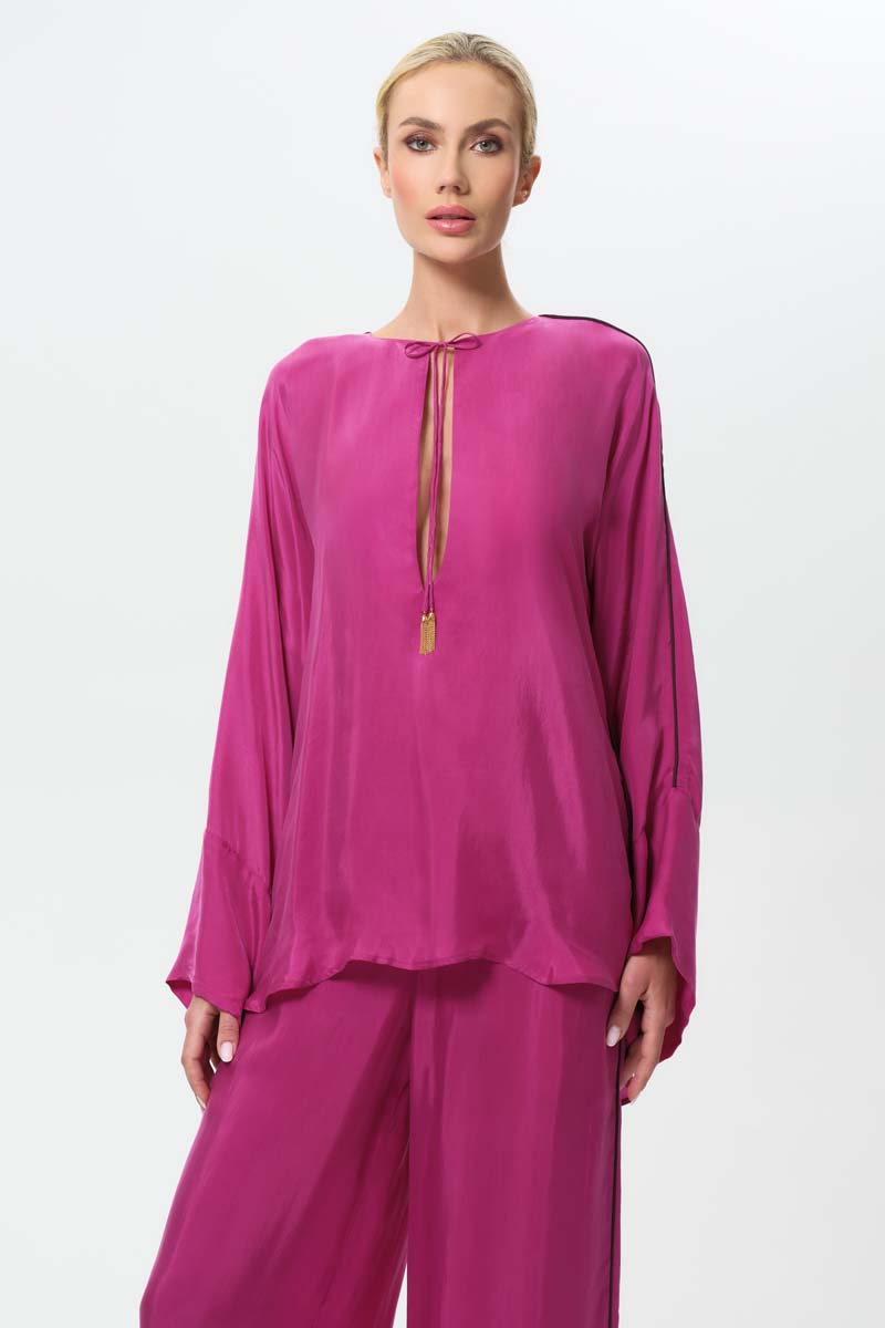 Lustrous and effortless, the Calypso Tunic Top was designed for utmost ease and versatility. This classic tunic top features a loose fit and a low V neck for that can be worn open for added allure or tied at the top for a demurer yet equally sophisticated look. We recommend pairing this tunic top with the matching lounge pants for a more elevated outfit, or pair it with jeans for a more laid back style.
