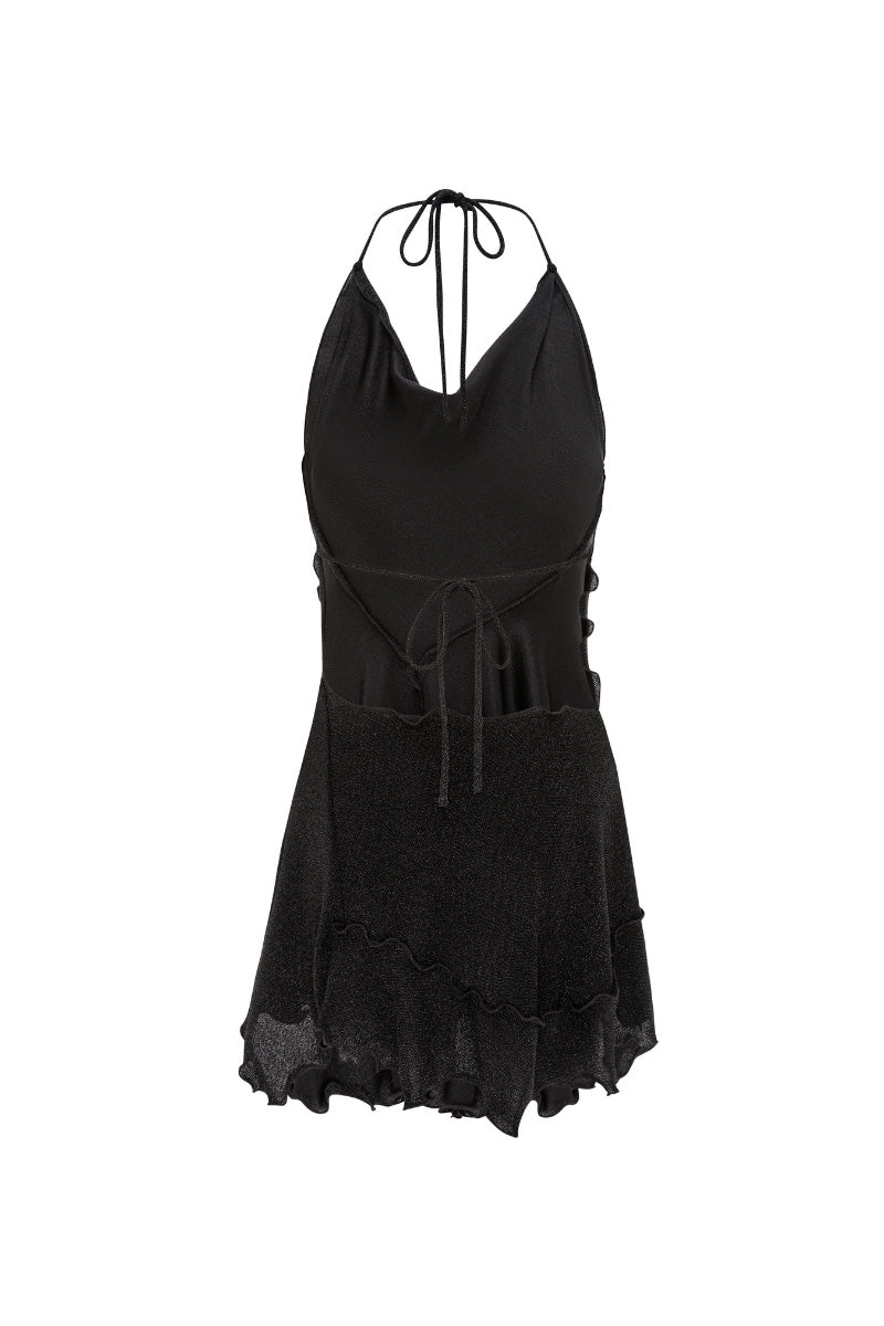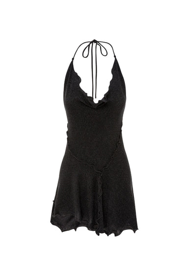 Black Mini Dress crafted from sparkly lurex fabric, featuring delicate pico-finished edges throughout. Designed with a halter neckline that ties at the neck and back, it showcases an open back and an asymmetrical skirt hem for a fluid, feminine silhouette.