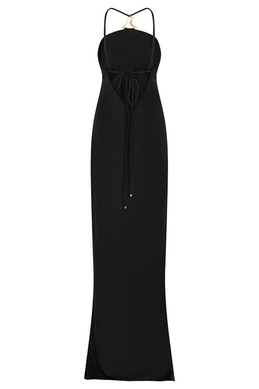 A clean, floor-skimming slip with a sculptural halter and an open, lace-up back. Minimal front; high-impact back.