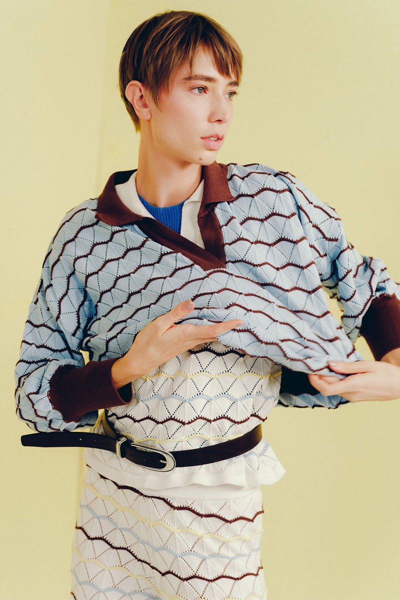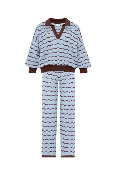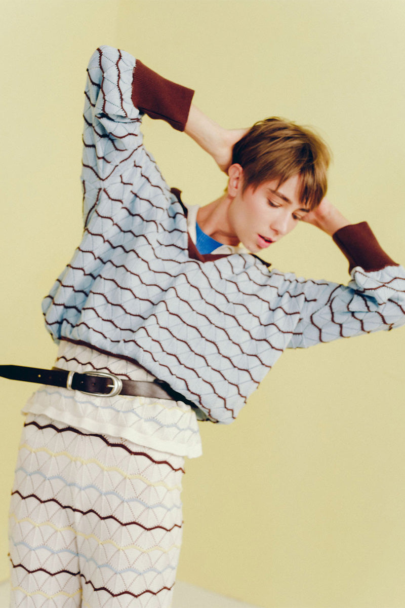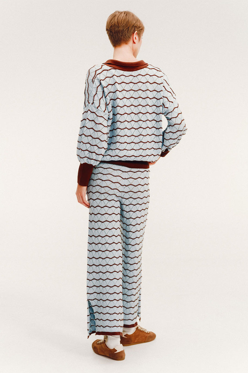 - Crochet- knit texture with wavy pattern in light blue and brown
