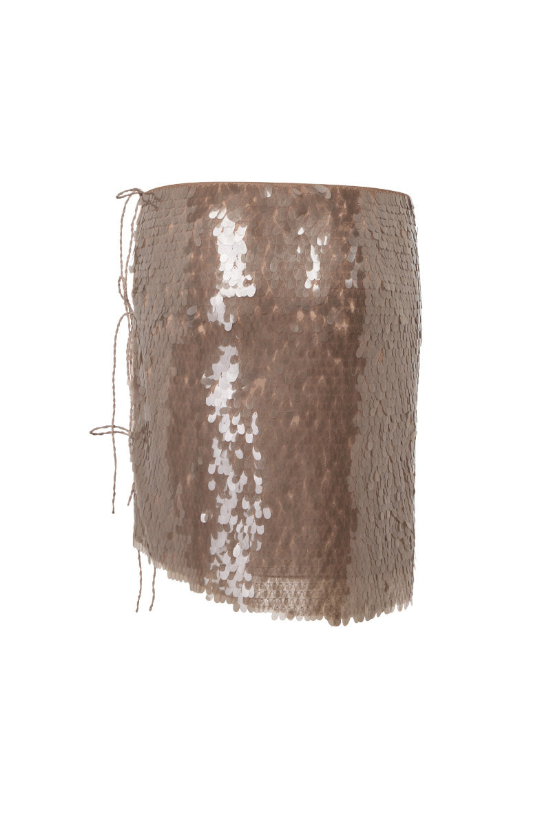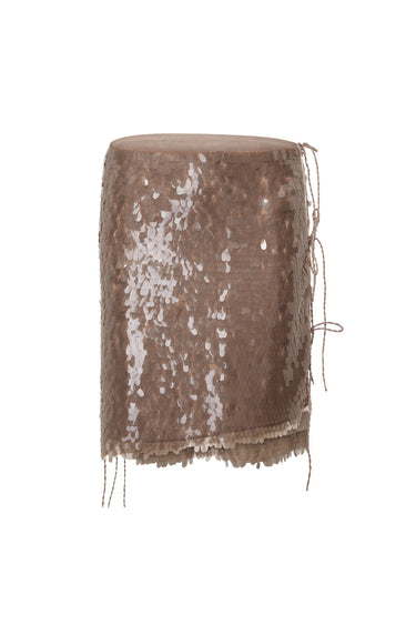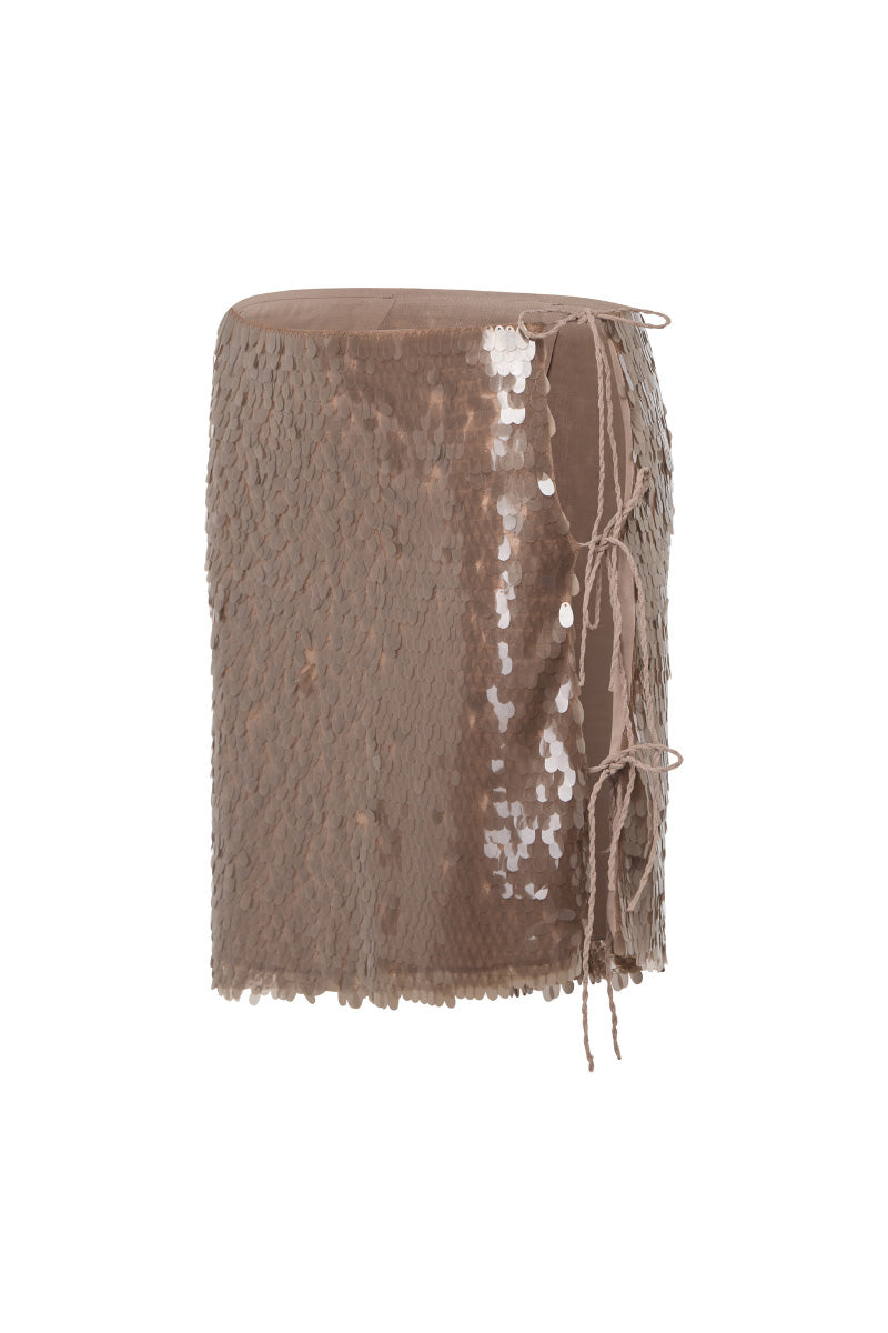 Brown Sequins Midi Skirt crafted in a shimmering brown sequin fabric. Featuring a low-waisted fit with side-tie closures.
