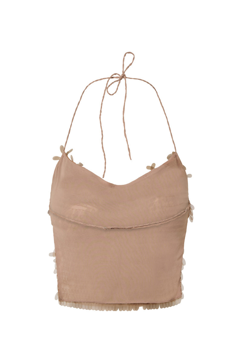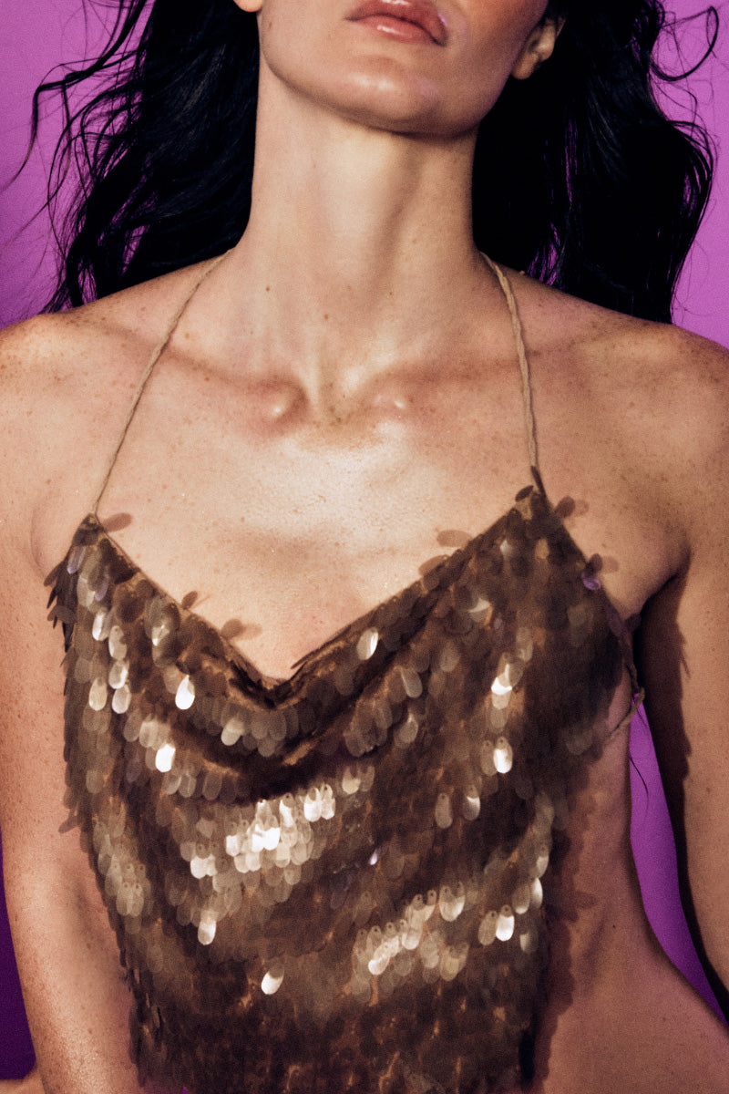 Brown Sequins Top is designed with a halter neckline and a daring open back, this top glimmers with delicate sequins. It features slim, adjustable straps at the back for a custom fit, combining a flattering silhouette.