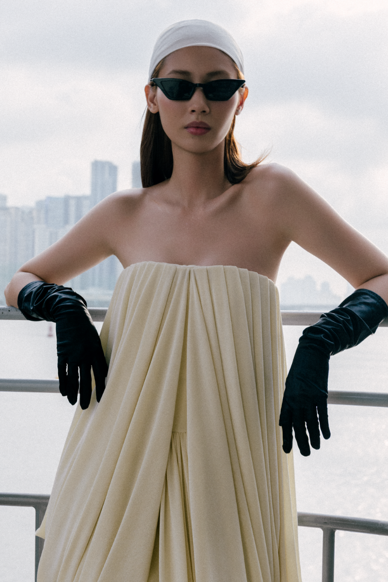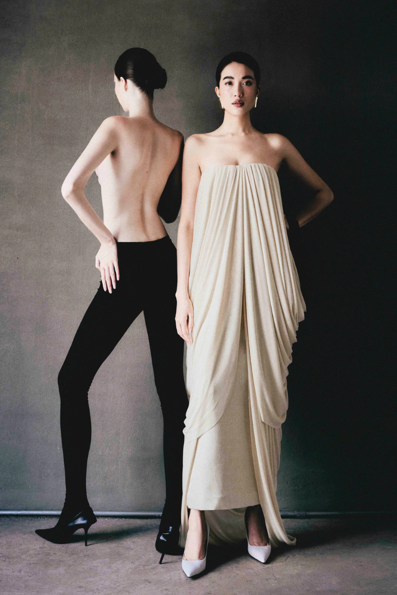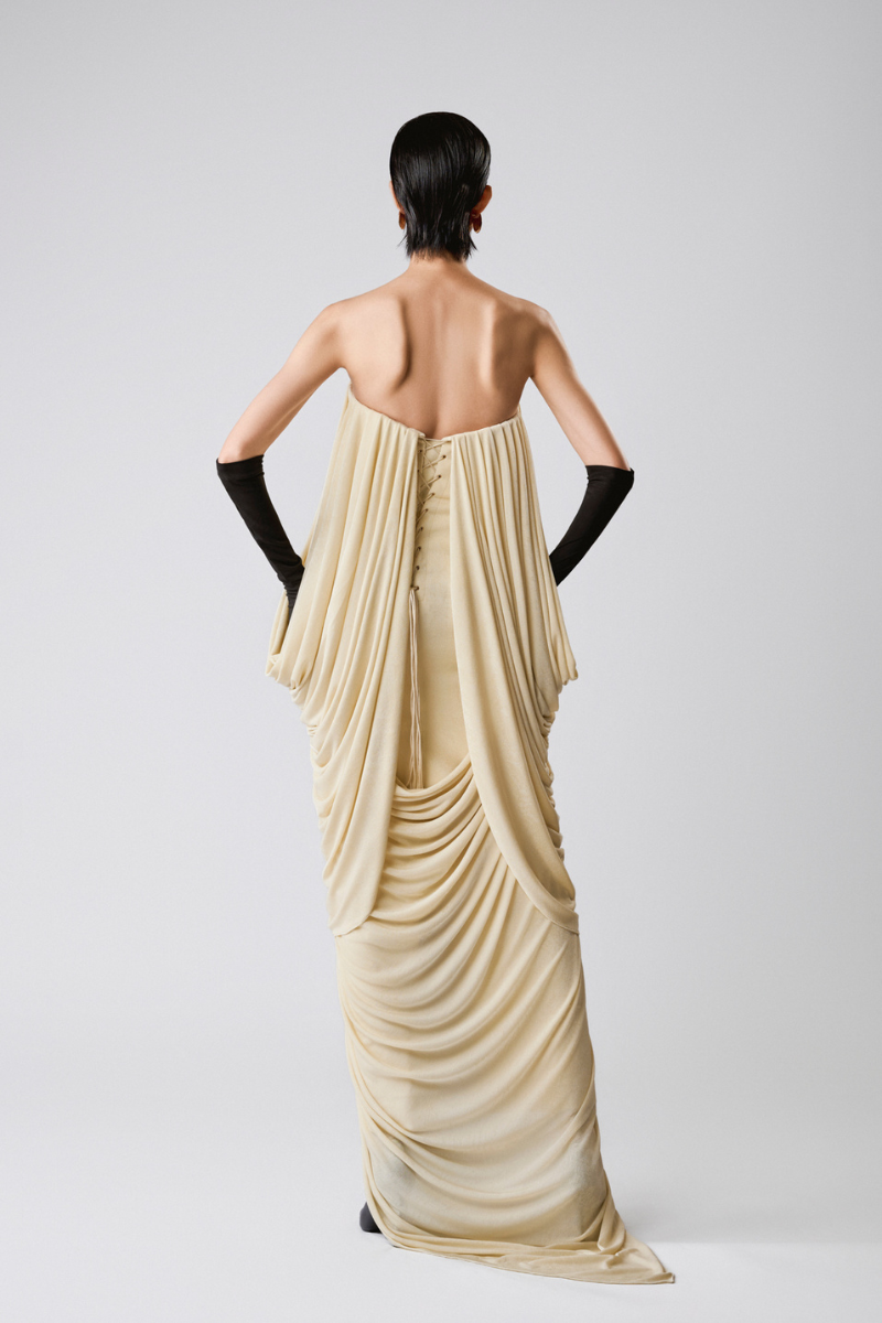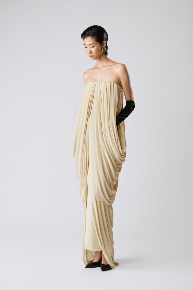 Shimmering stretch knit with front-facing symmetrical draping from bust to floor. The strapless column silhouette is subtly structured beneath the flow to retain form while embracing fluidity. A dreamlike interplay of soft light and form — architectural, yet ethereal.