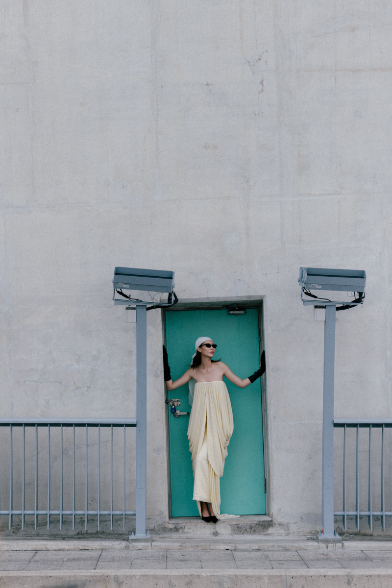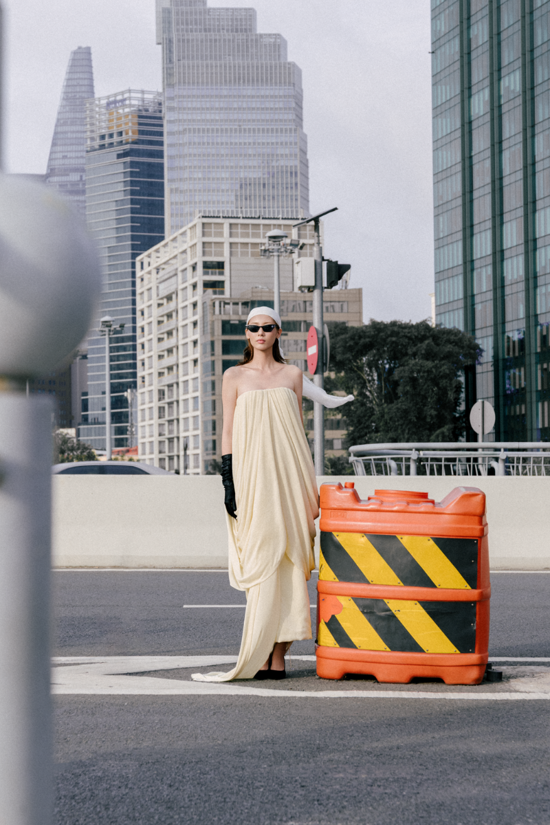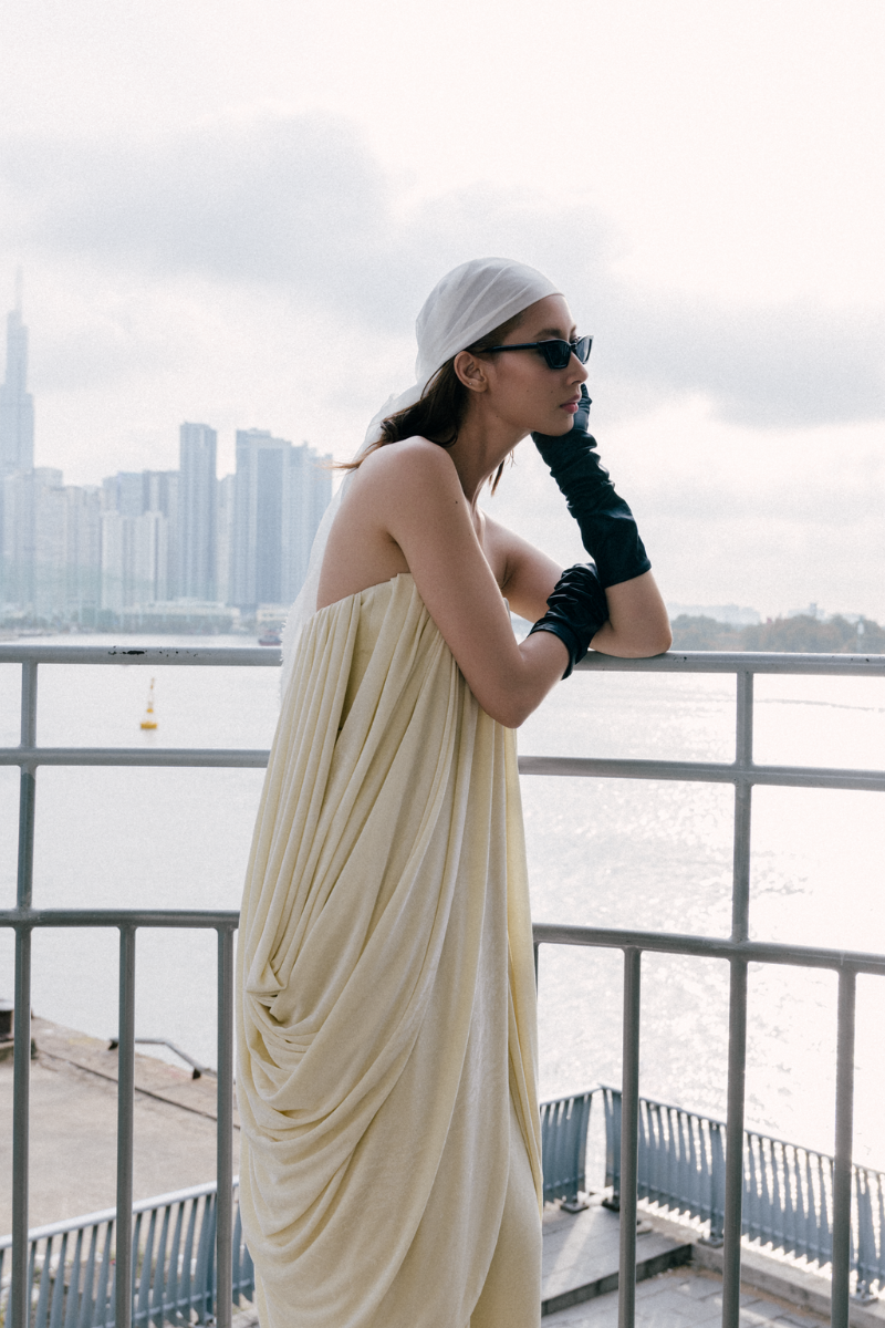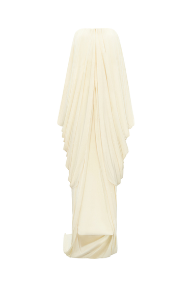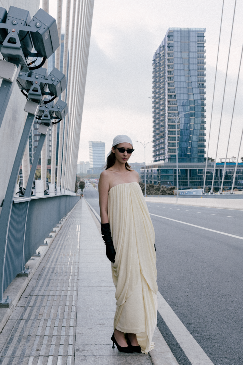 Shimmering stretch knit with front-facing symmetrical draping from bust to floor. The strapless column silhouette is subtly structured beneath the flow to retain form while embracing fluidity. A dreamlike interplay of soft light and form — architectural, yet ethereal.