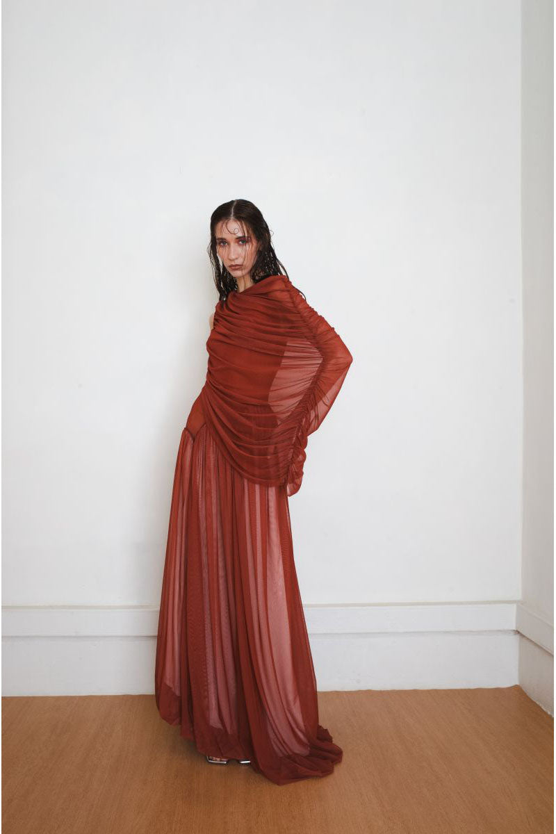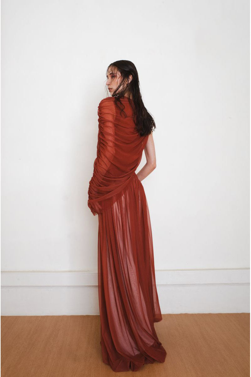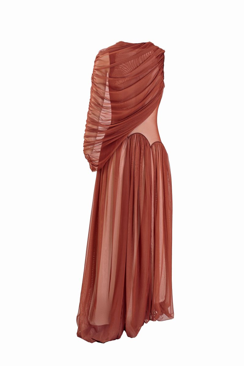 One-sleeve gown crafted from stretch rust tulle, featuring sculptural draping across the bodice and hips, and flared curved godets inserted along the skirt.