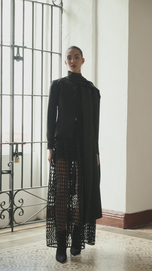 - Satin piece at back collar that can be work as a cape, collar or wrapped in different ways.