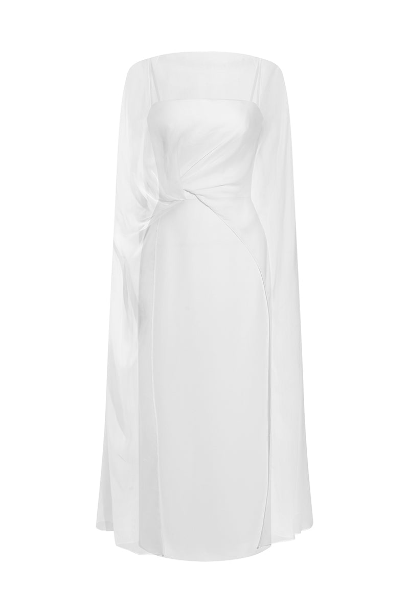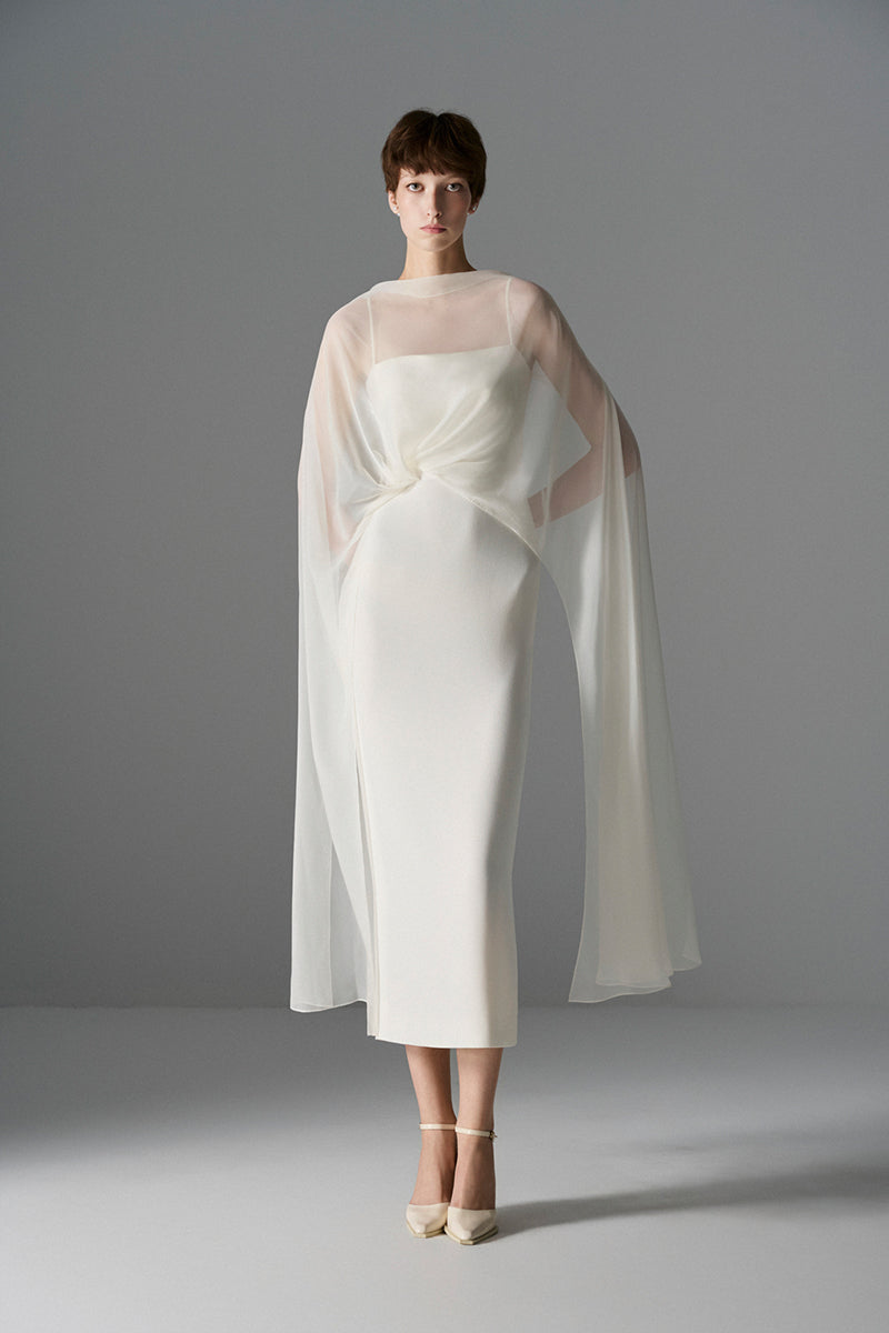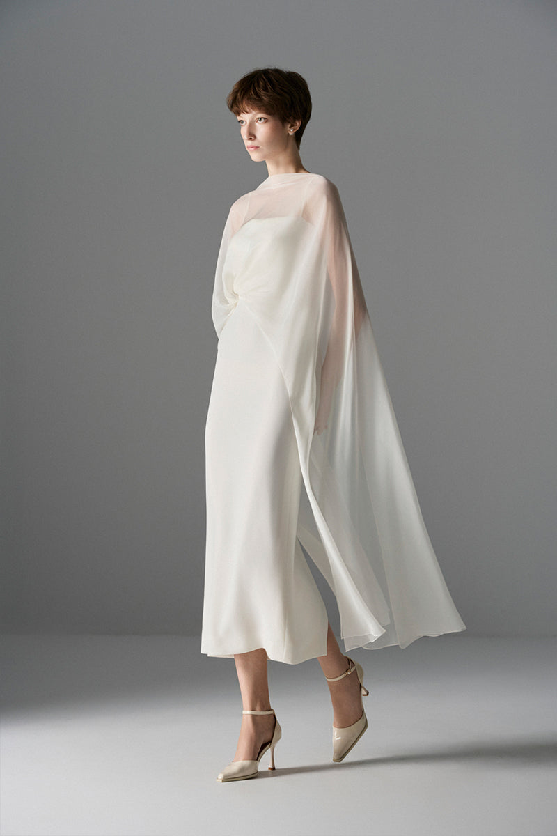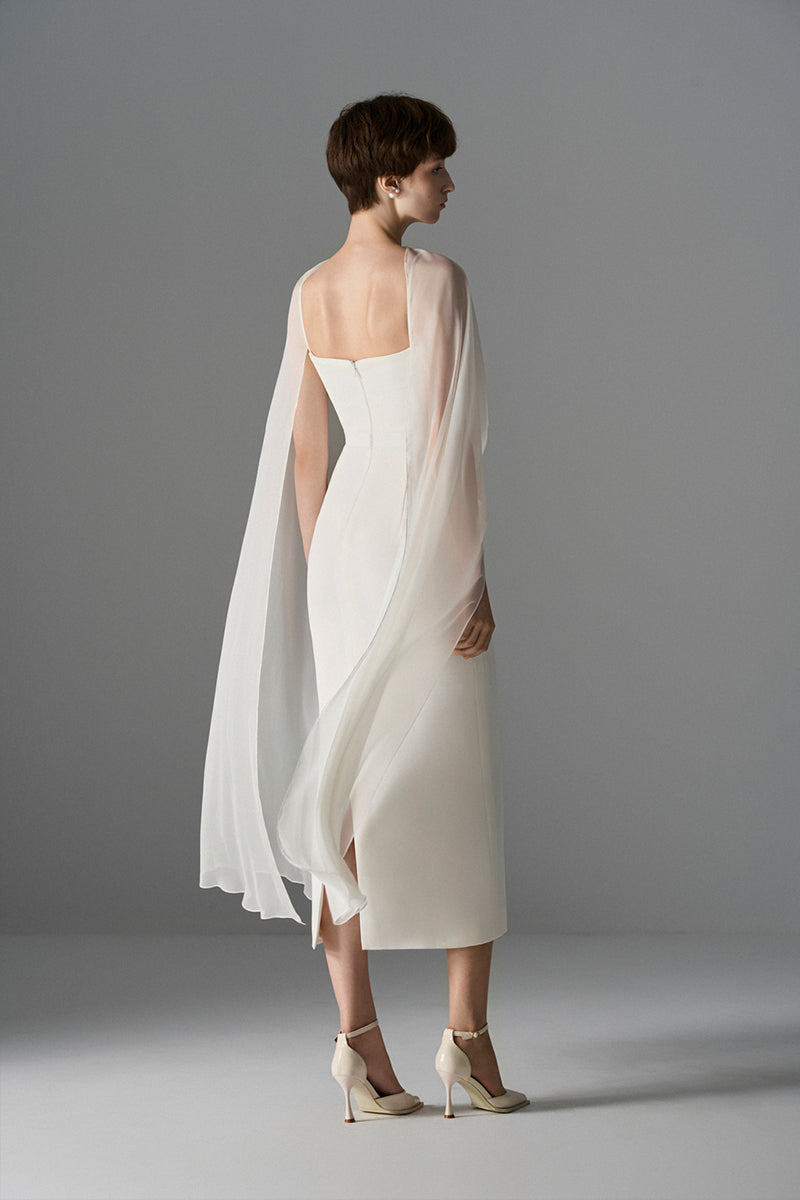 - Sheer cape made of chiffon, which flows gracefully from the neckline.
