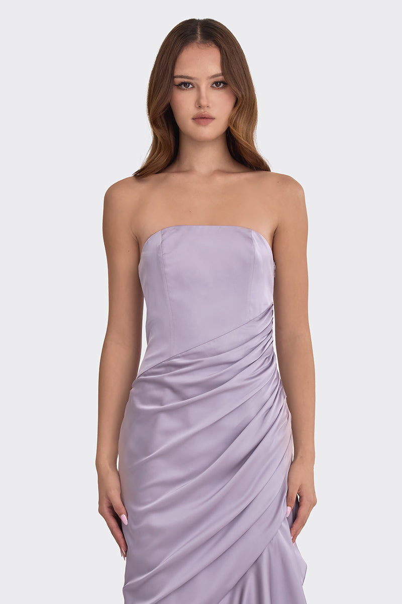 - Strapless dress with delicate ruching and gathering details.