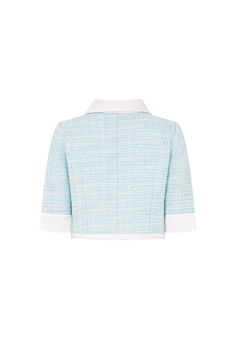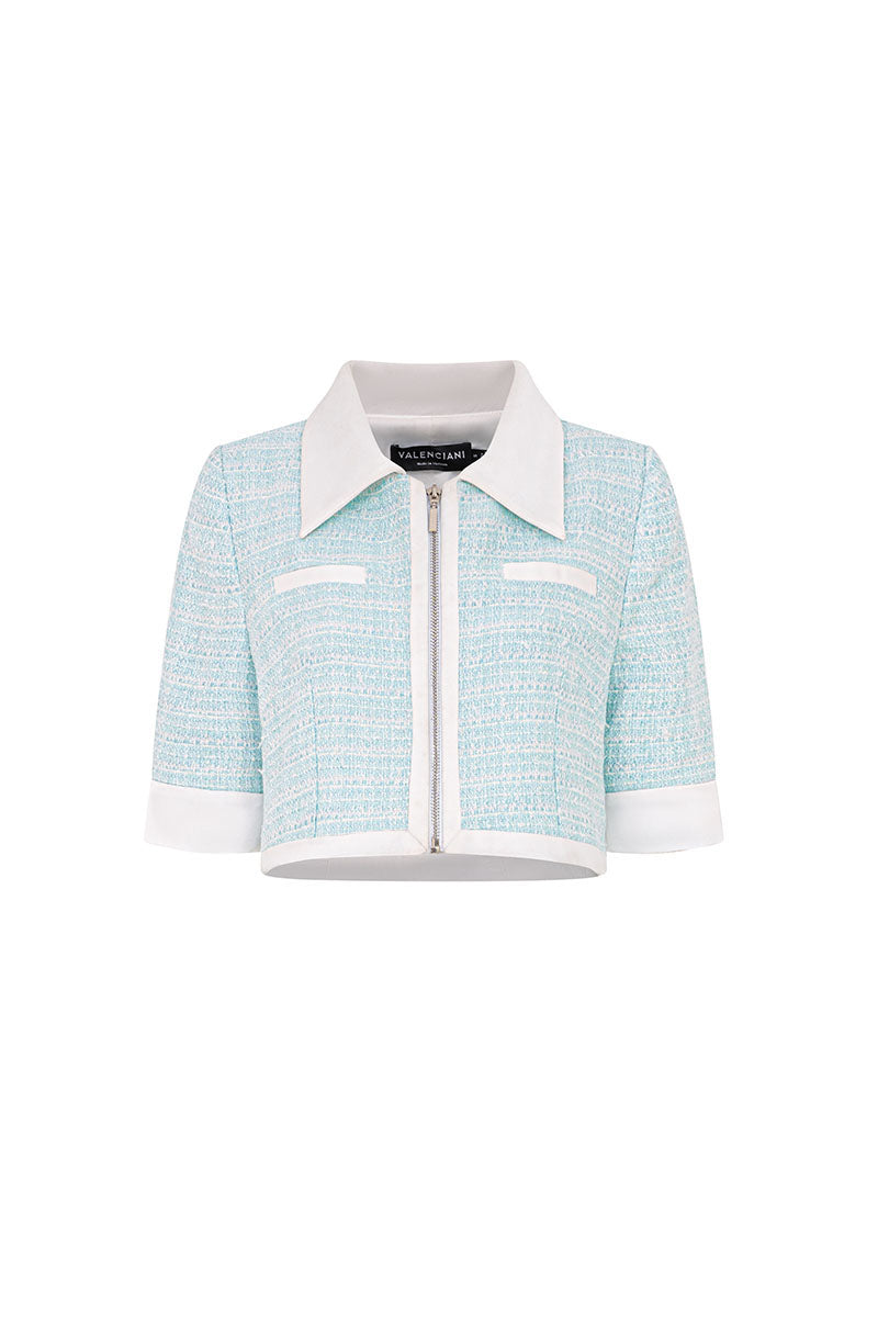 The top is a chic, cropped jacket crafted from a textured mint green tweed fabric with hints of white. It features short sleeves, a zip-front closure, and is beautifully accented with a contrasting white collar and white trim along the hem.