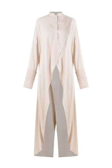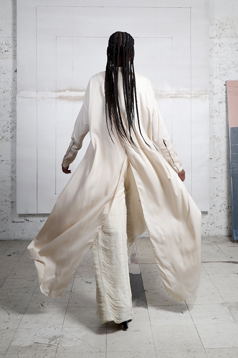 - A reinterpretation of the classic white shirt, transformed into a long and architectural dress