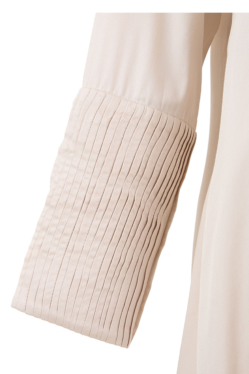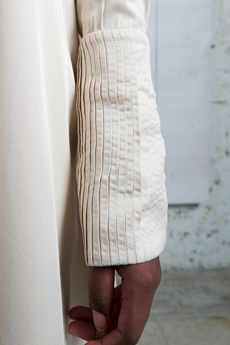 - Cuffs with pleated detailing and three engraved mother-of-pearl buttons