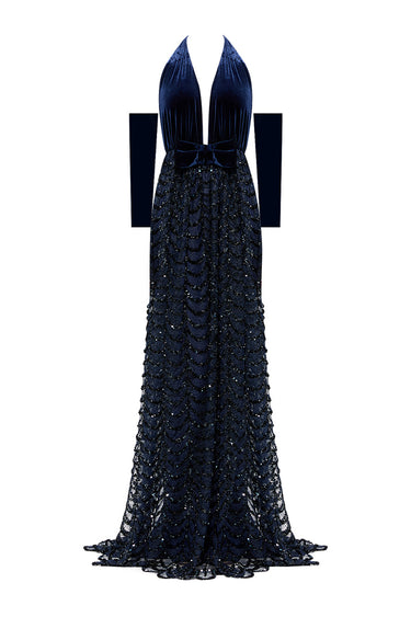 - The dress is crafted from navy velvet for a sophisticated look