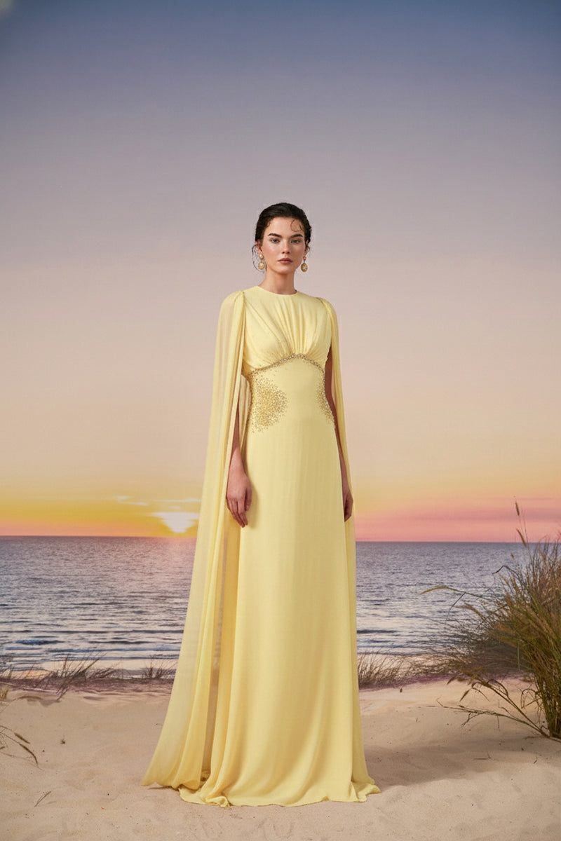 - Long cape sleeves with soft fluid drape