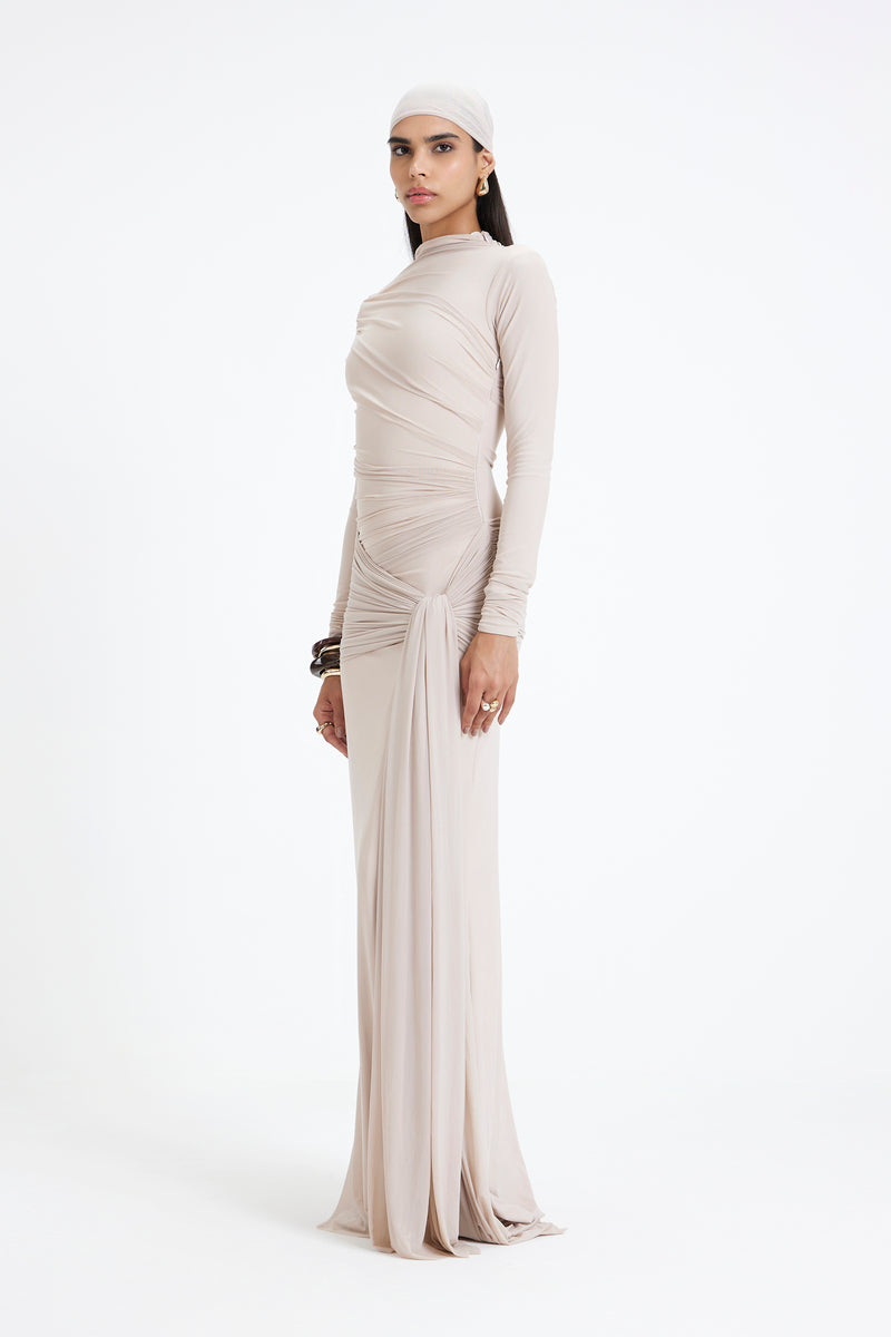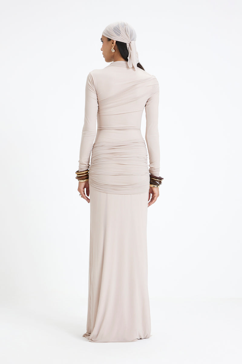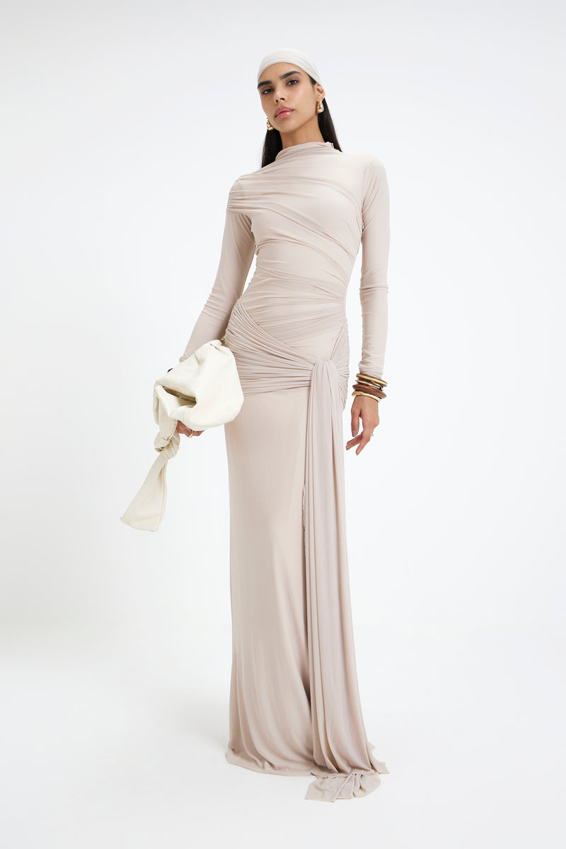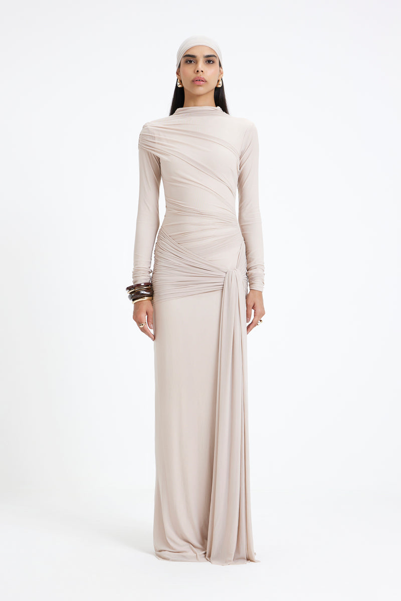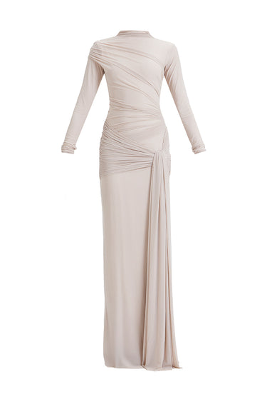 - The high neckline and full-length sleeves lend a sense of modest sophistication,