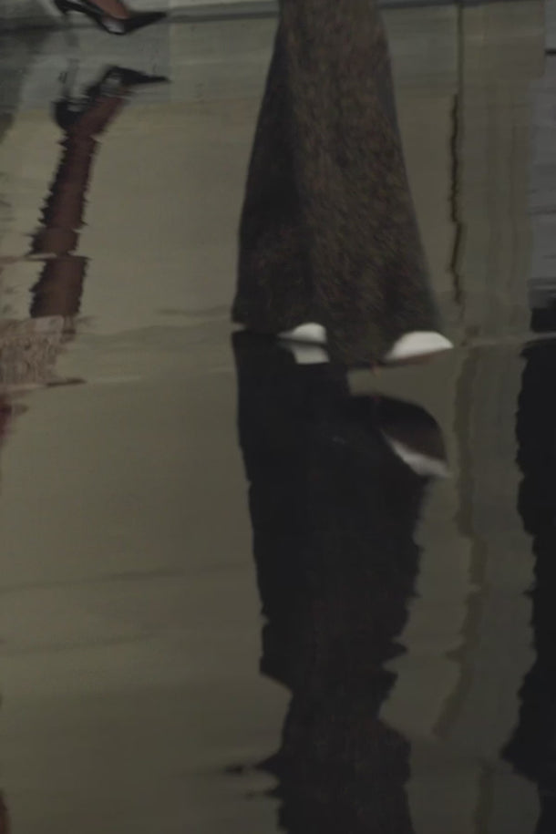 The DETRUIRE is a halter neck top in black-caramel textured tweed with tulle overlay, a raw-edged appliqué detailing and open back design with adjustable drawstring ties.