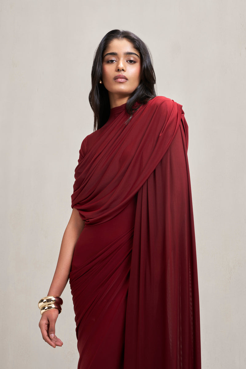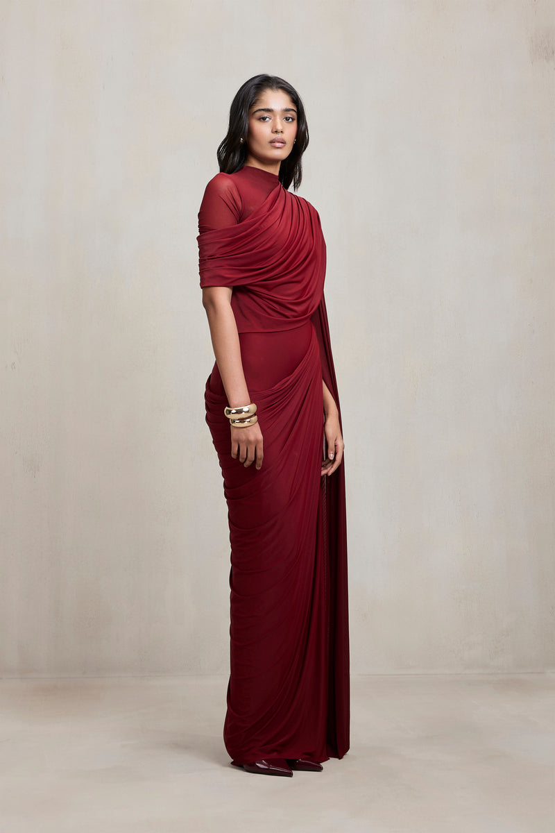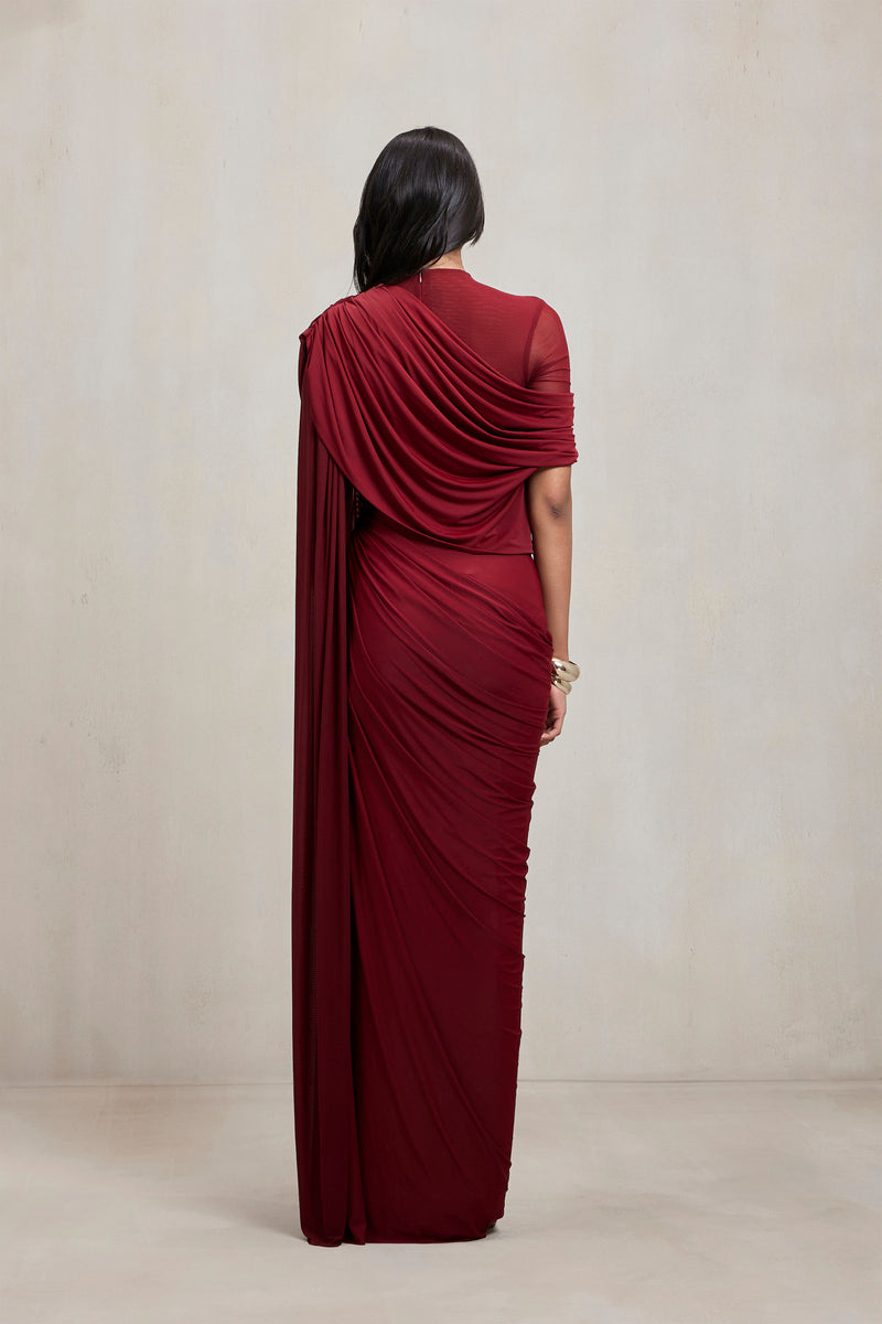 This gown, crafted in stretch fabric, features draping and a sheer illusion right shoulder that adds lightness and contrast to its seamless floor-length silhouette