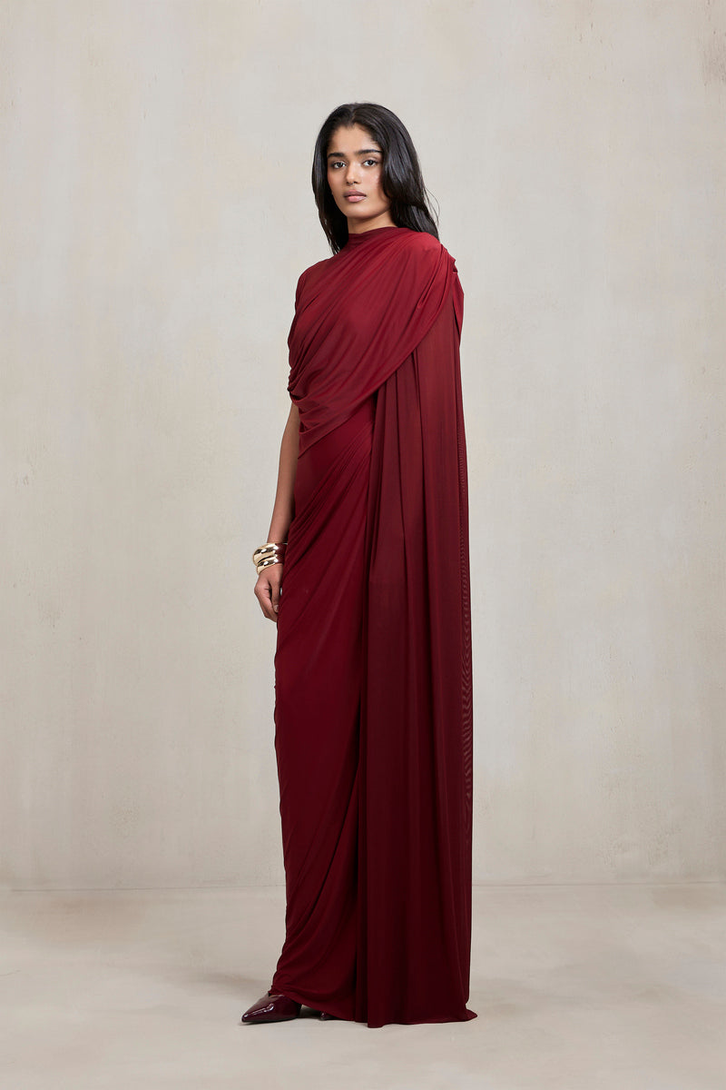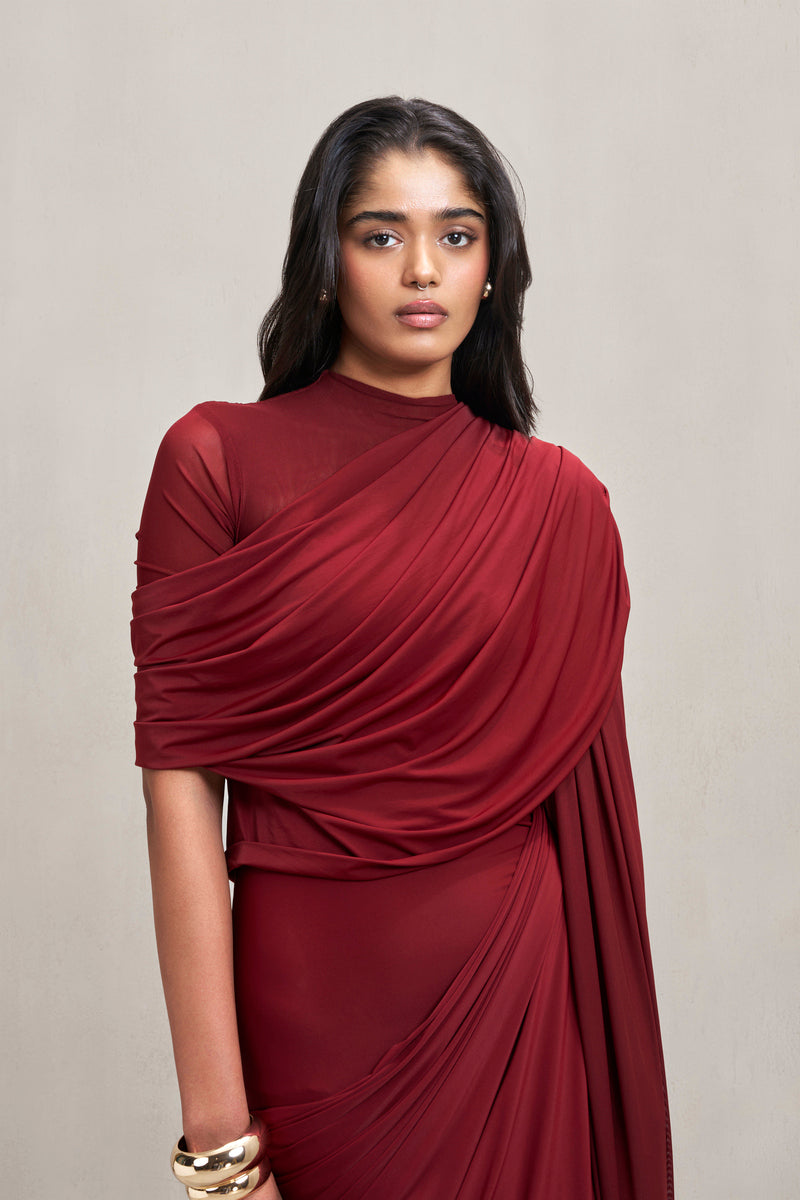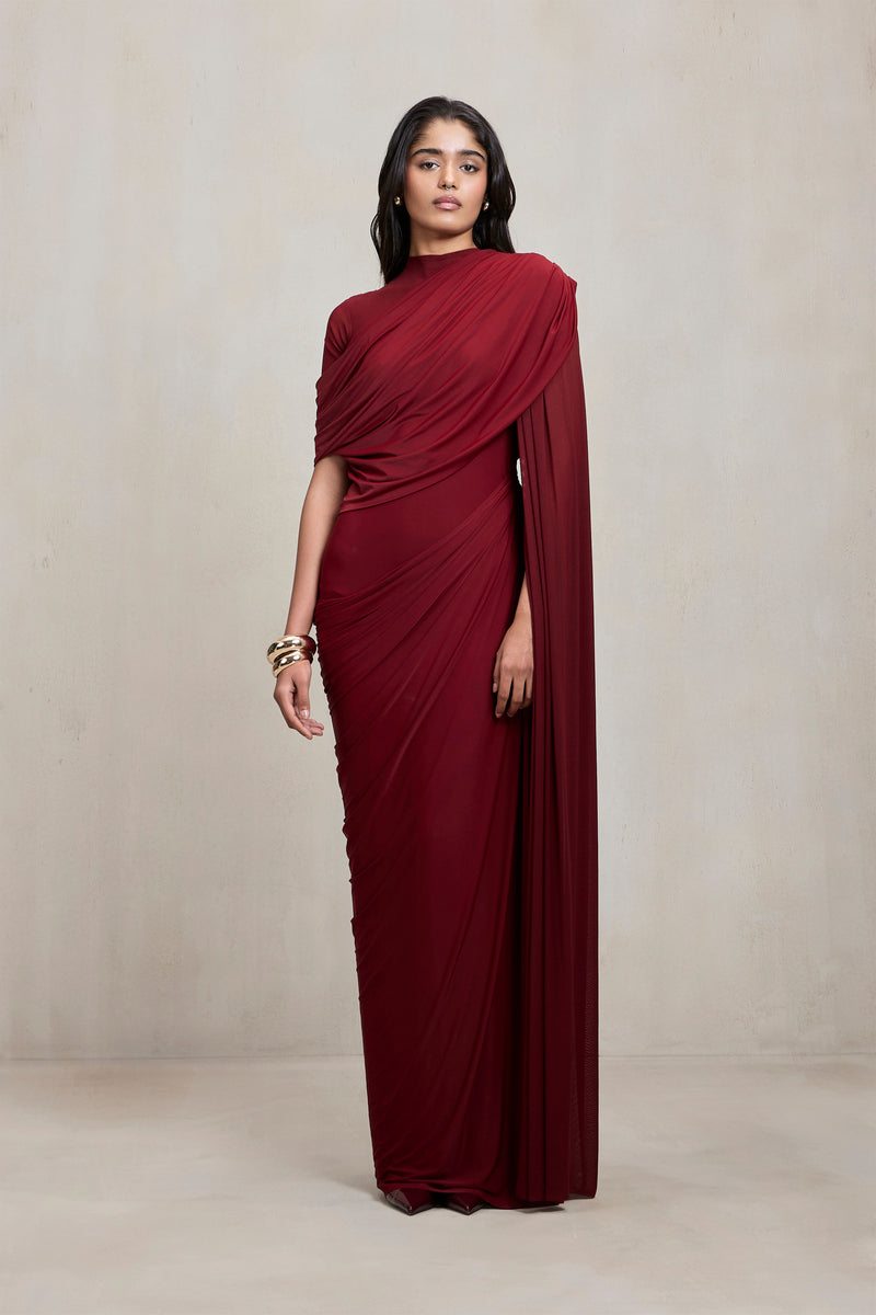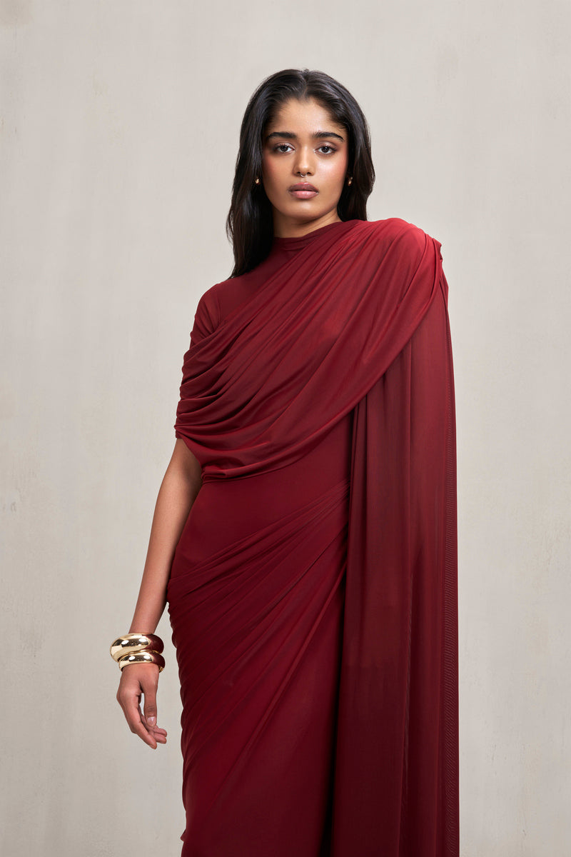 This gown, crafted in stretch fabric, features draping and a sheer illusion right shoulder that adds lightness and contrast to its seamless floor-length silhouette